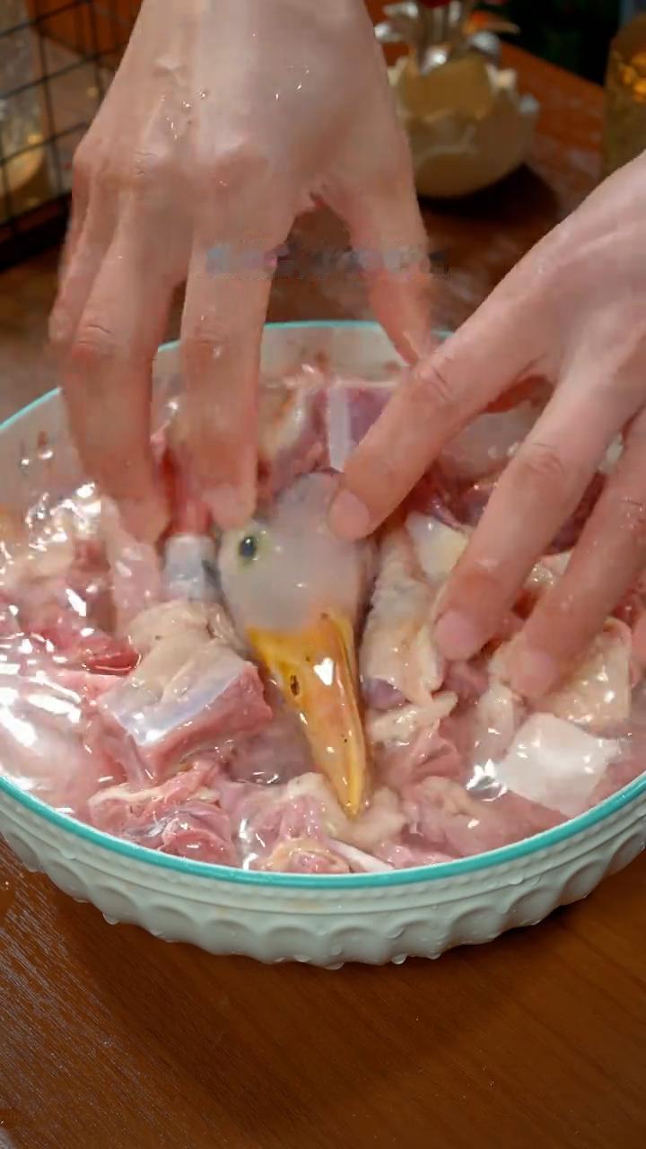 ·新鲜的鸭子是不需要焯水的,只需要加一勺面粉抓拌2分钟,然后再用清水洗干净,这样既能去腥又能保留营养。你看这些都是腥味的来源。
