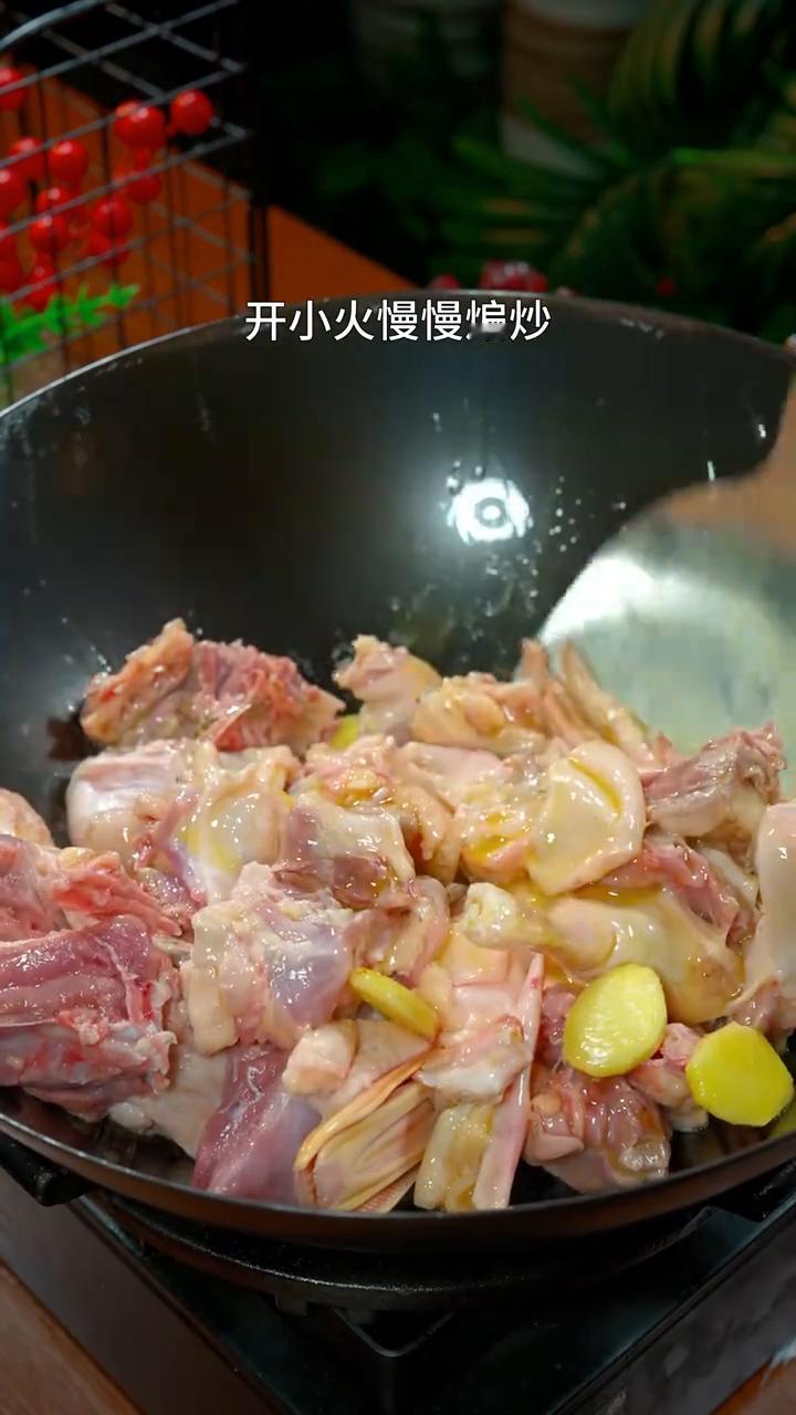 ·另起锅,菜籽油热放点姜片爆香,再下入鸭肉,开小火慢慢煸炒,把里面的鸡油炒出来才是肥而不腻的关键。