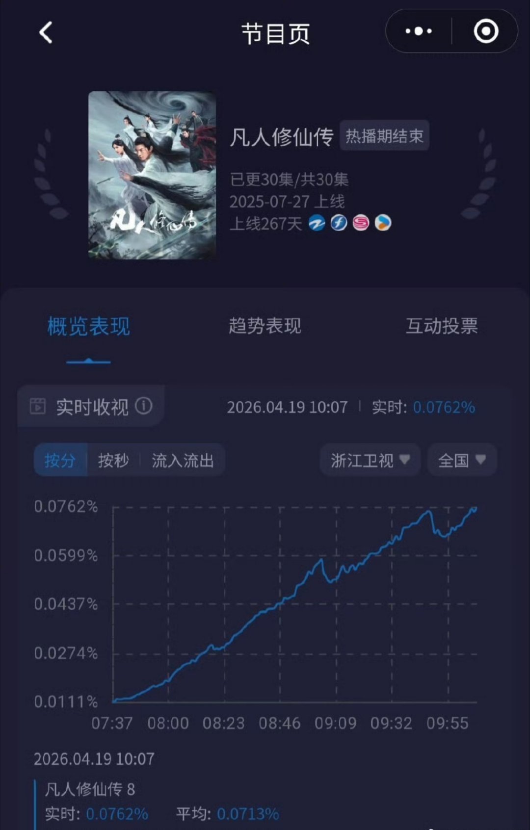 杨洋播一部爆一部的含金量还在上升,浙江卫视白天档重播凡人修仙传,收视创下近期非黄金档收视新高。2025浙江卫视年度收视冠军凡人修仙传,2026年重播又创收视新高,杨洋爆剧宇宙加1!!