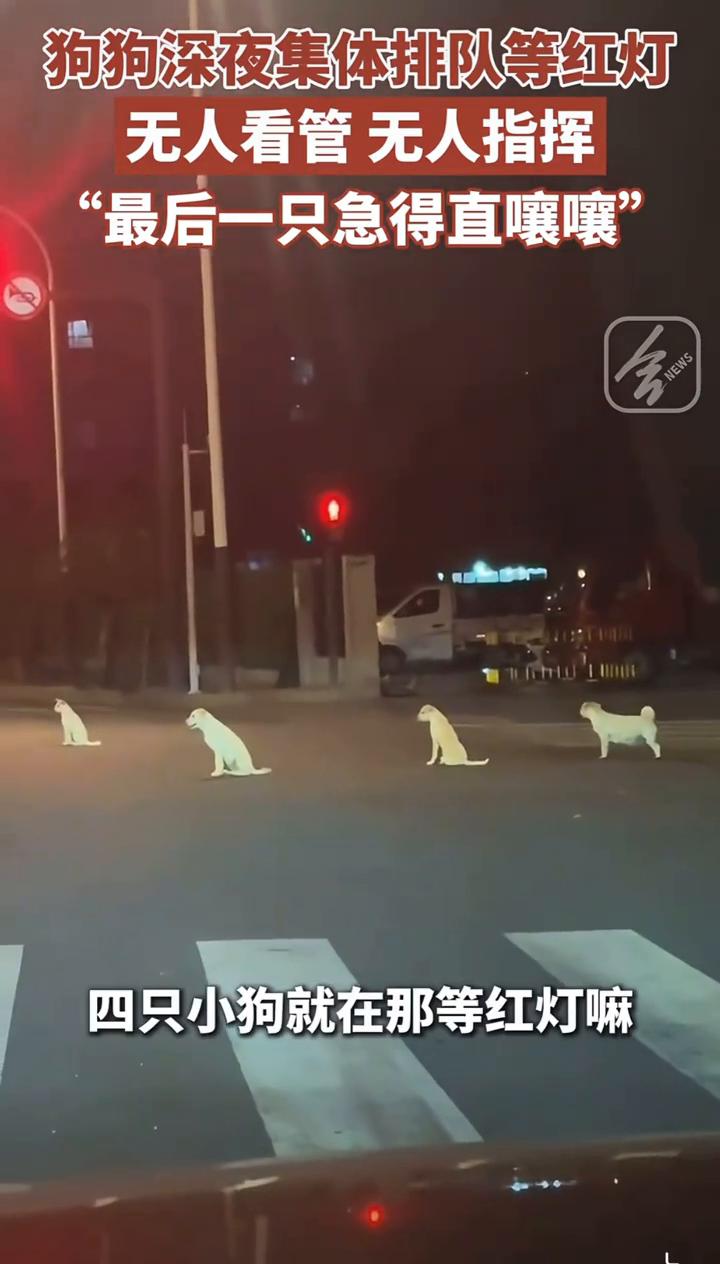狗狗深夜集体排队等红灯,无人看管无人指挥,最后一只急得直嚷嚷。 8月12日,江苏。当时就是狗狗周围也没什么人,也没有主人,四只小狗就在那等红灯,后面那只狗一直叫,催它们赶紧走,但前面就不走,当时就是狗狗。