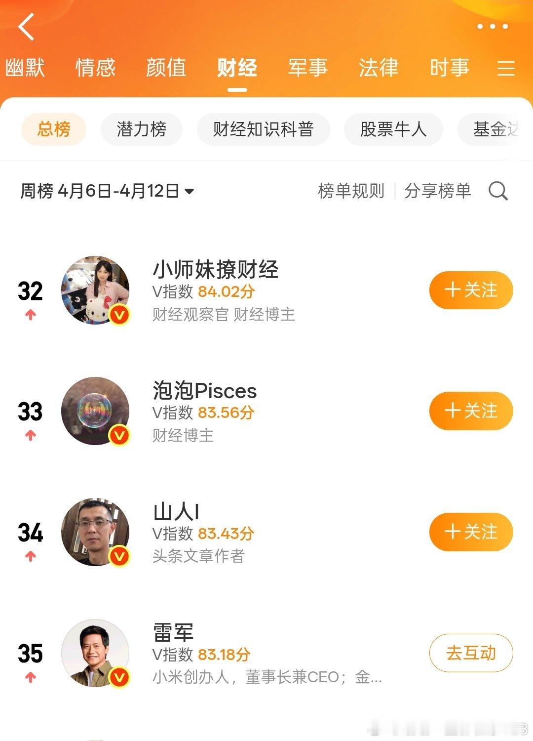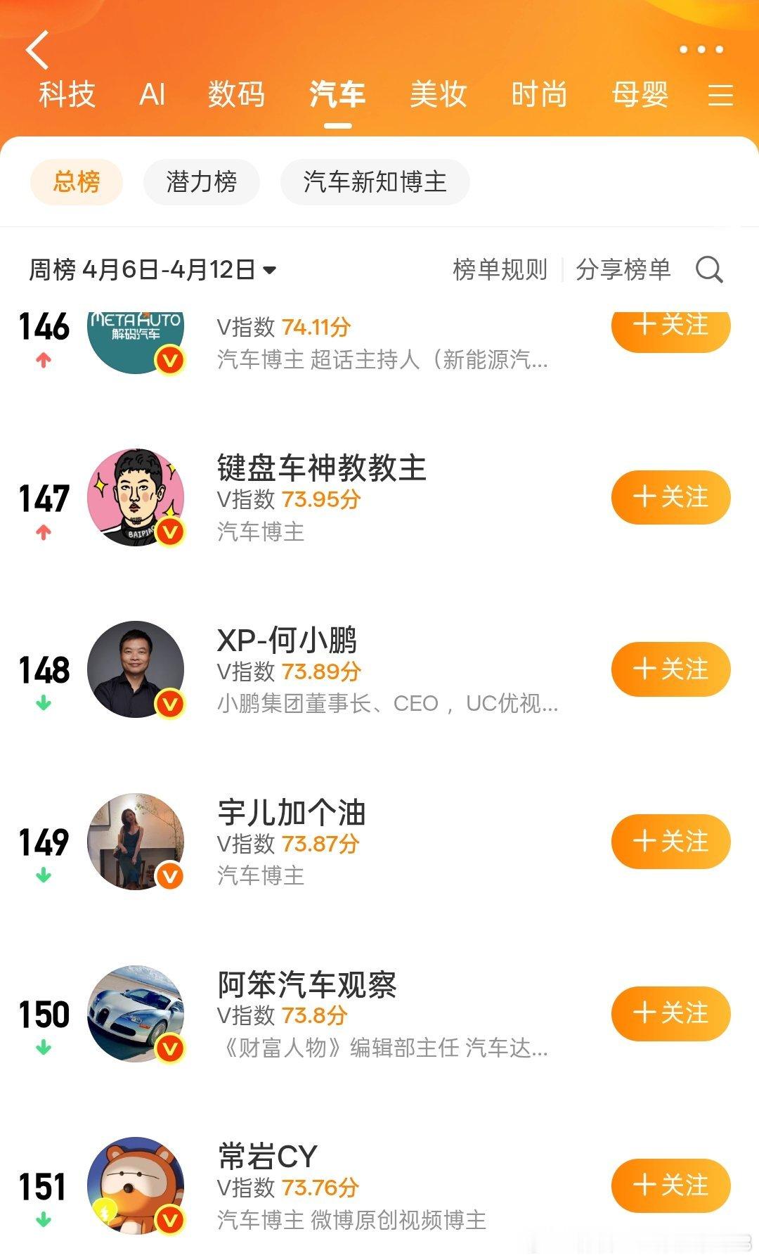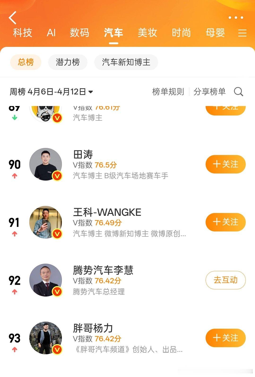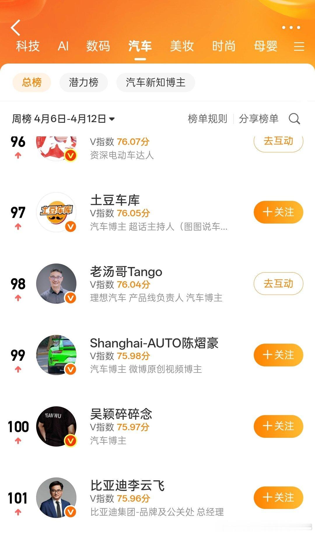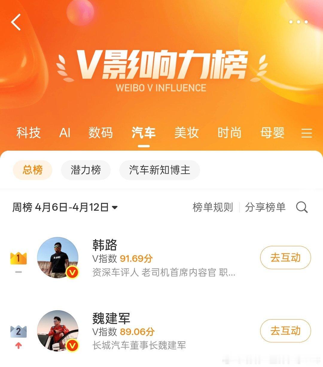 老魏轻轻一发力就进TOP3了瞄了一眼,汽车板块前100里基本都是专职自媒体,车企高管里除了魏总就只有两位排在92位排在98位当然,也有个原因,雷总这些个大佬...不在汽车榜单里以及有些大佬压根不在意这东西。