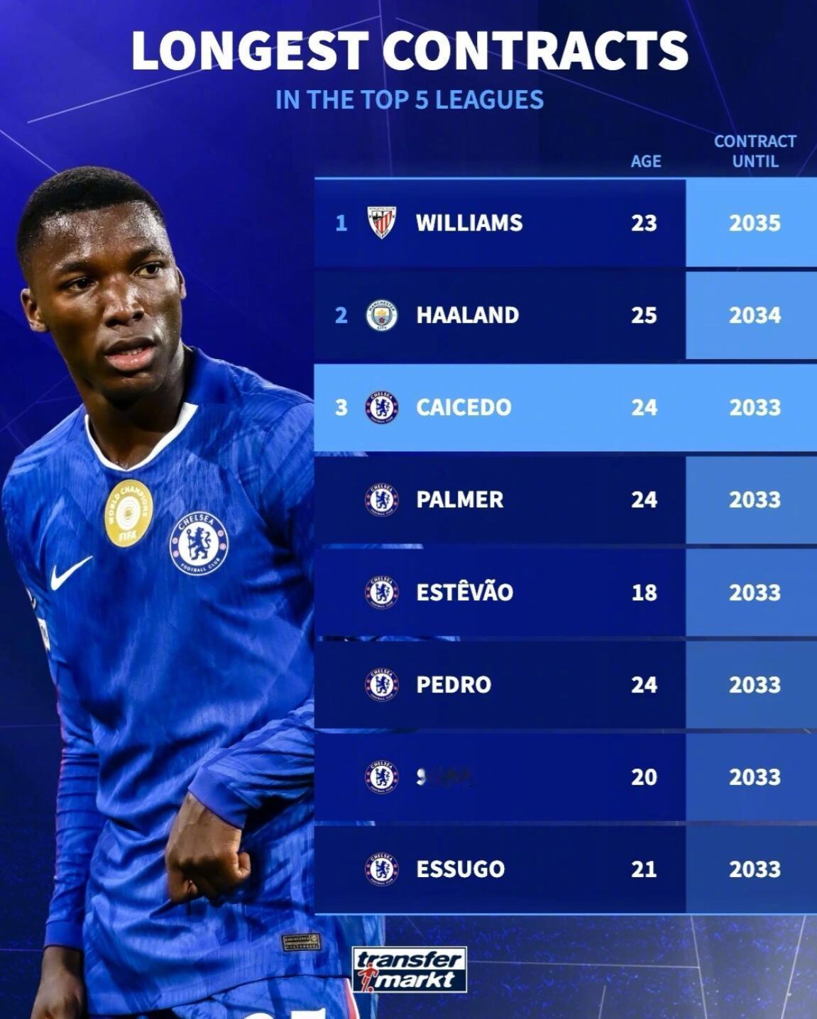 ★五大联赛球员最长合同榜单!