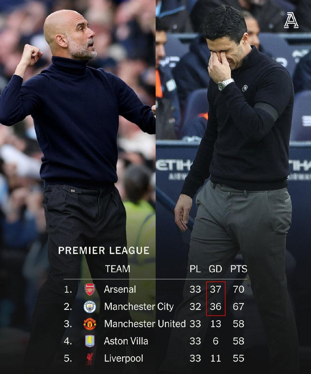 而现在阿森纳33战70分,净胜球37个,曼城32战67分,净胜球36个,瓜迪奥拉又看到了希望,而阿尔特塔的四连亚好像也不是不可能发生。