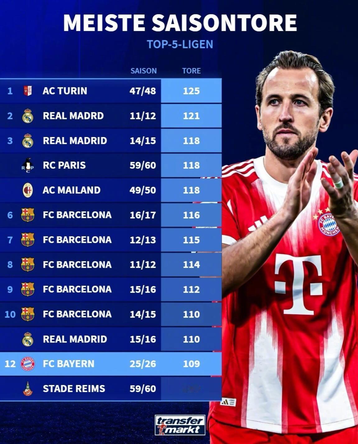 ★五大联赛史上球队单赛季联赛进球数排行榜!