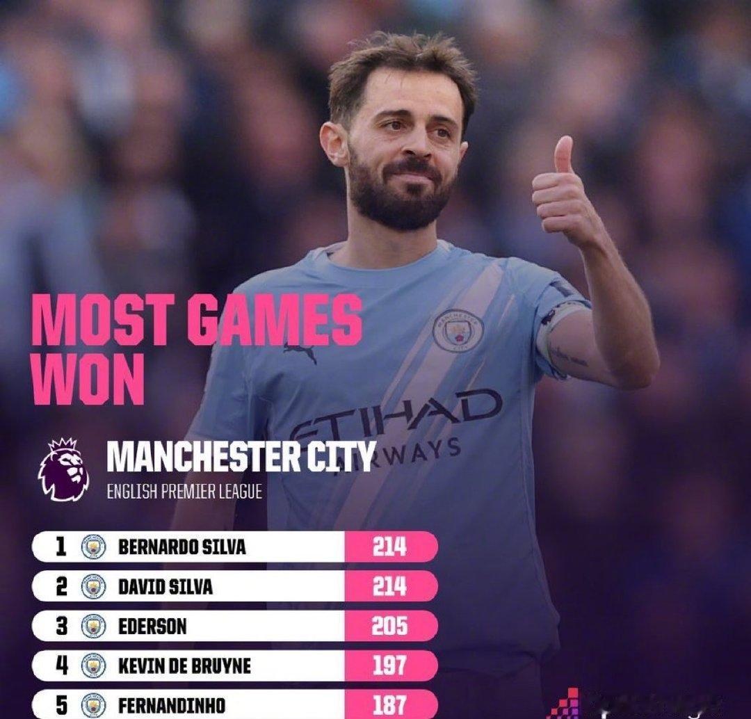 ★贝尔纳多·席尔瓦代表曼城在英超赢下了214场比赛,追平了大卫·席尔瓦的队史纪录,赛季末独享纪录已经是板上钉钉。