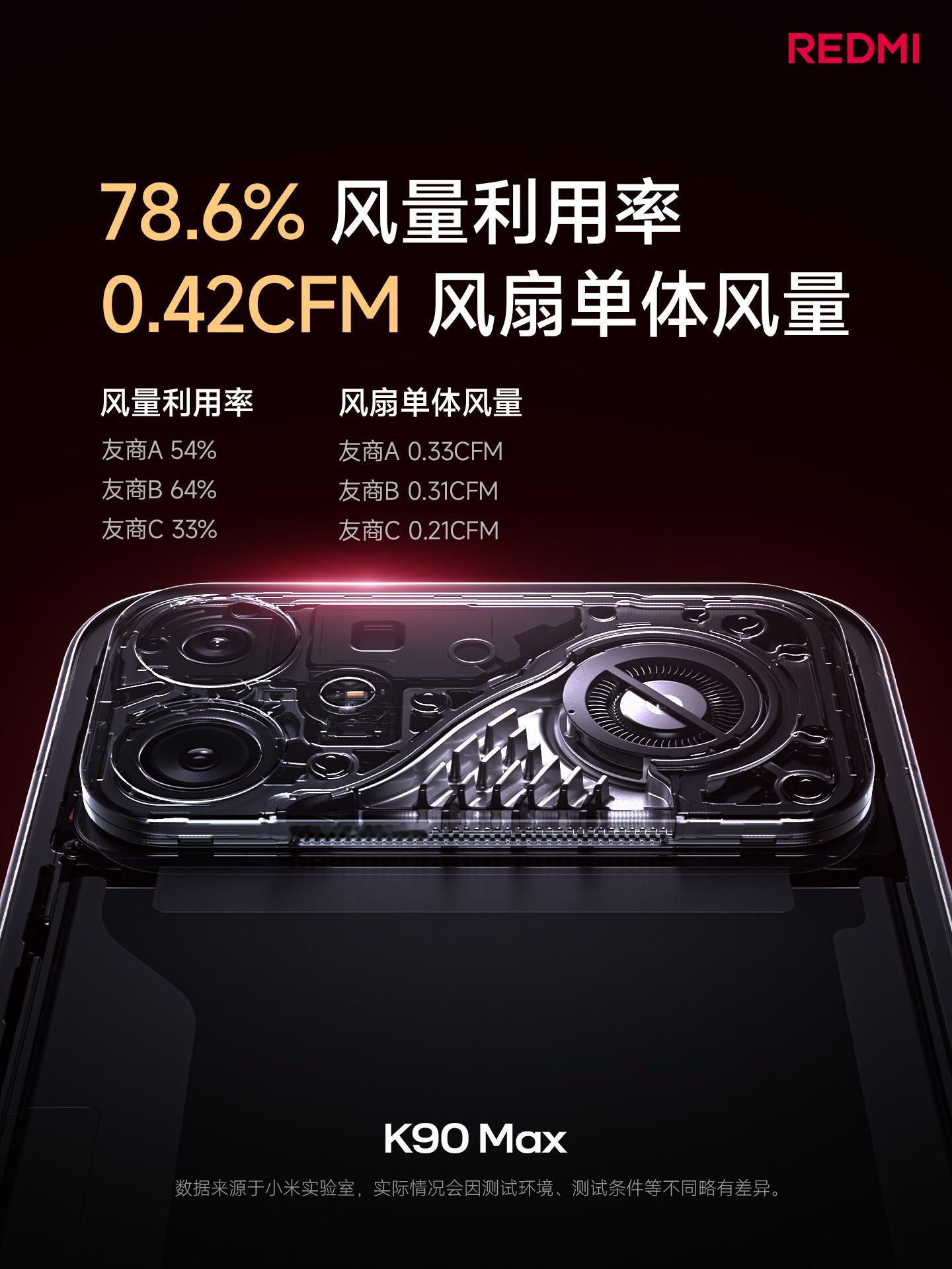 物理降温比硬降频靠谱多了,18mm的风扇塞进手机里,0.42CFM风量配合近80%的利用率,以后打一天游戏,不怕烫手了!红米K90Max发布会
