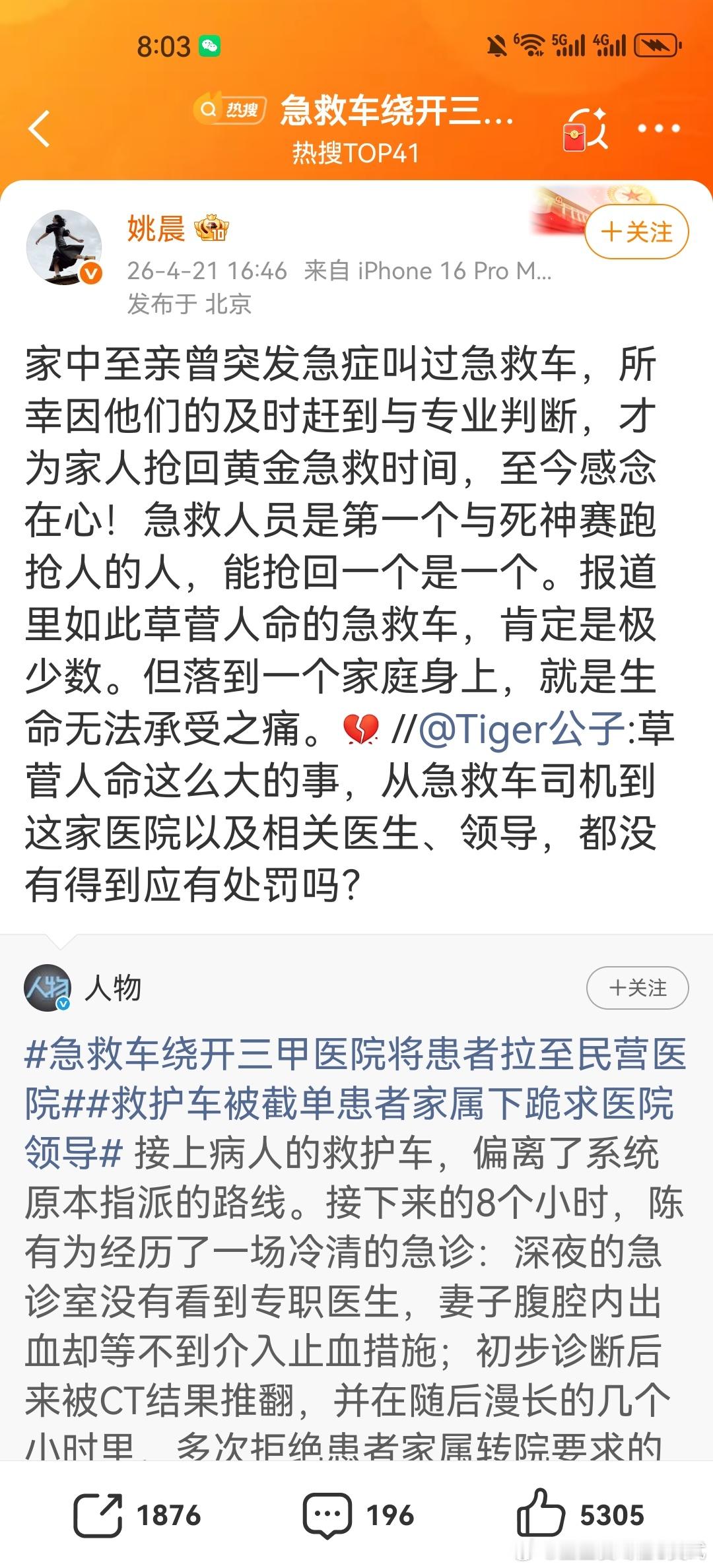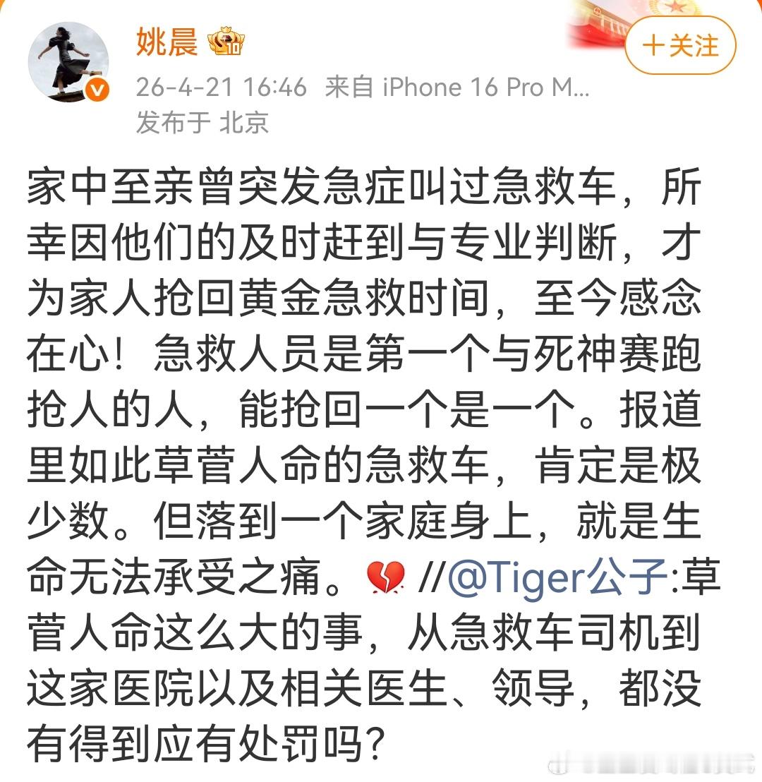 姚晨怒斥深圳违规私转患者救护车本该2.8公里到三甲,却被强行拉去3.8公里外的民营医院。家属跪求转院都被拖延,眼睁睁看着生命流逝。姚晨骂得对,这种突破底线的恶,必须严惩 !
