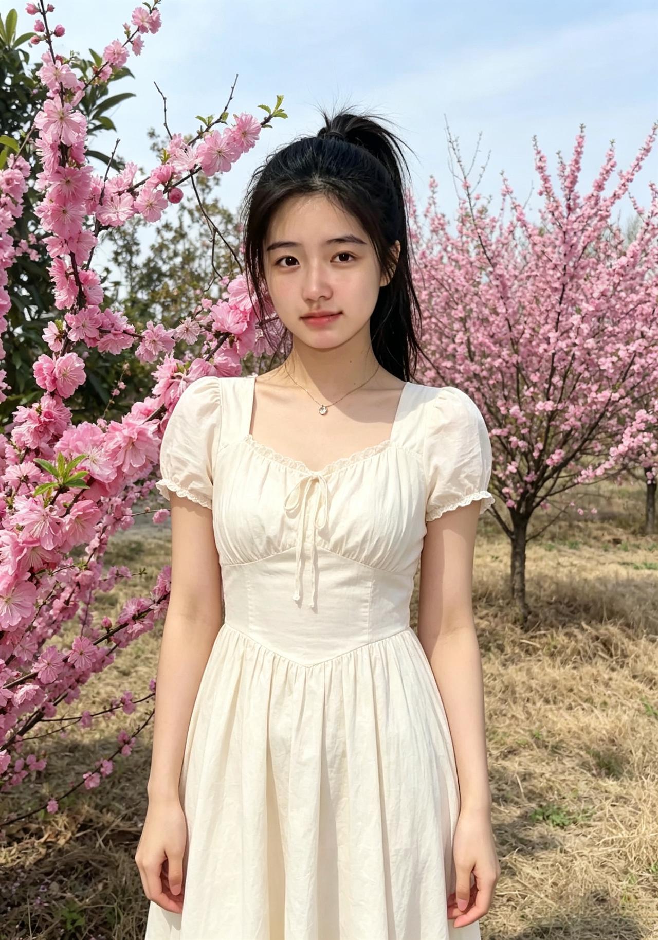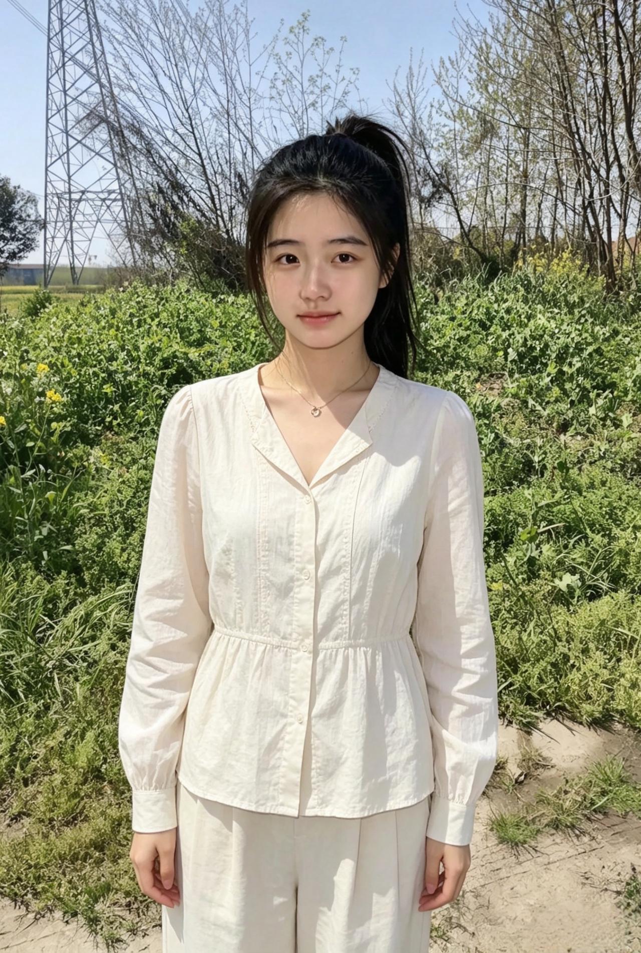 素衣闲立野溪边,柳色如烟映玉颜。 浅黛眉弯藏秀气,清风一缕伴身闲。
