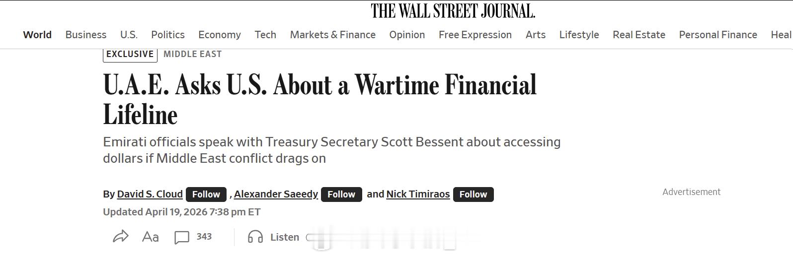 WSJ报道称,阿联酋政府已经正式请求美国政府向该国提供财政援助。