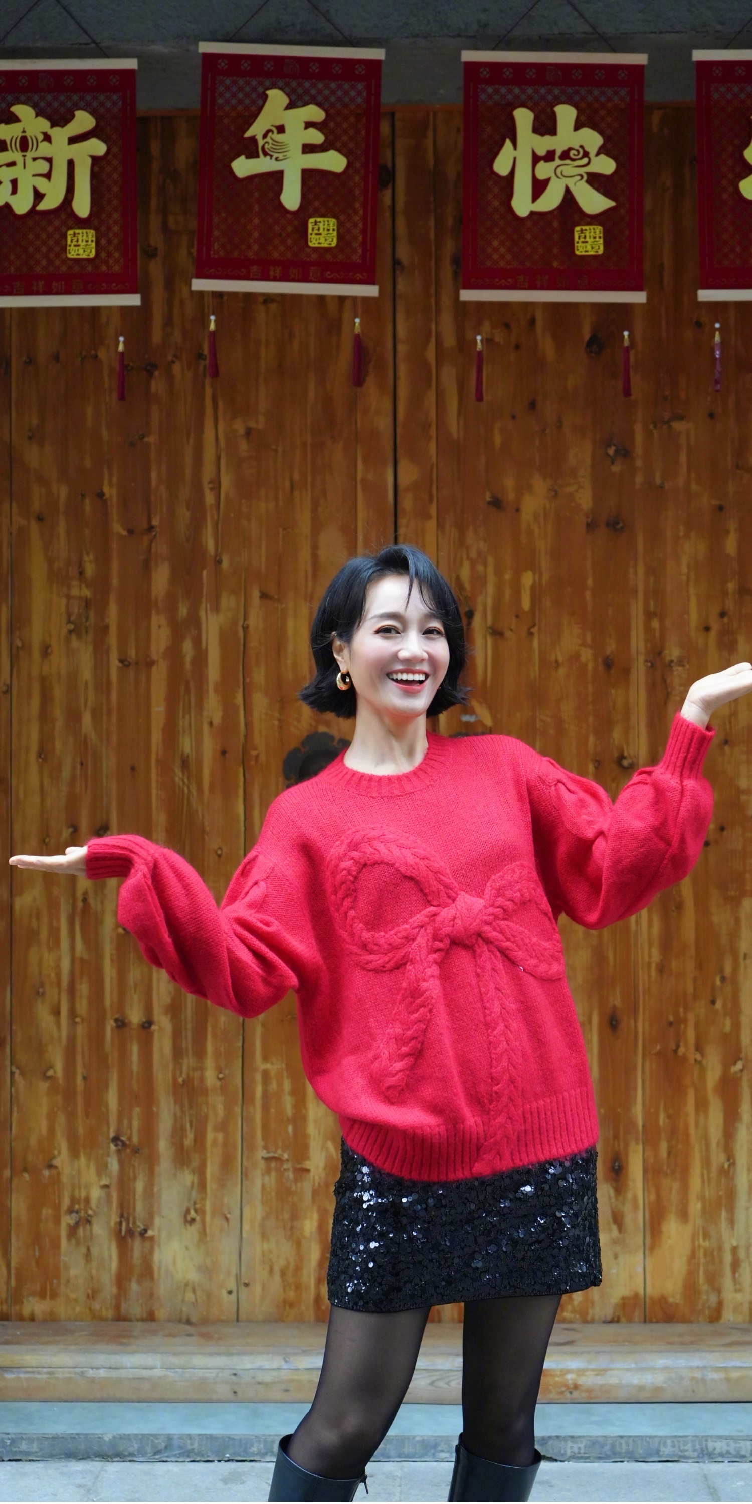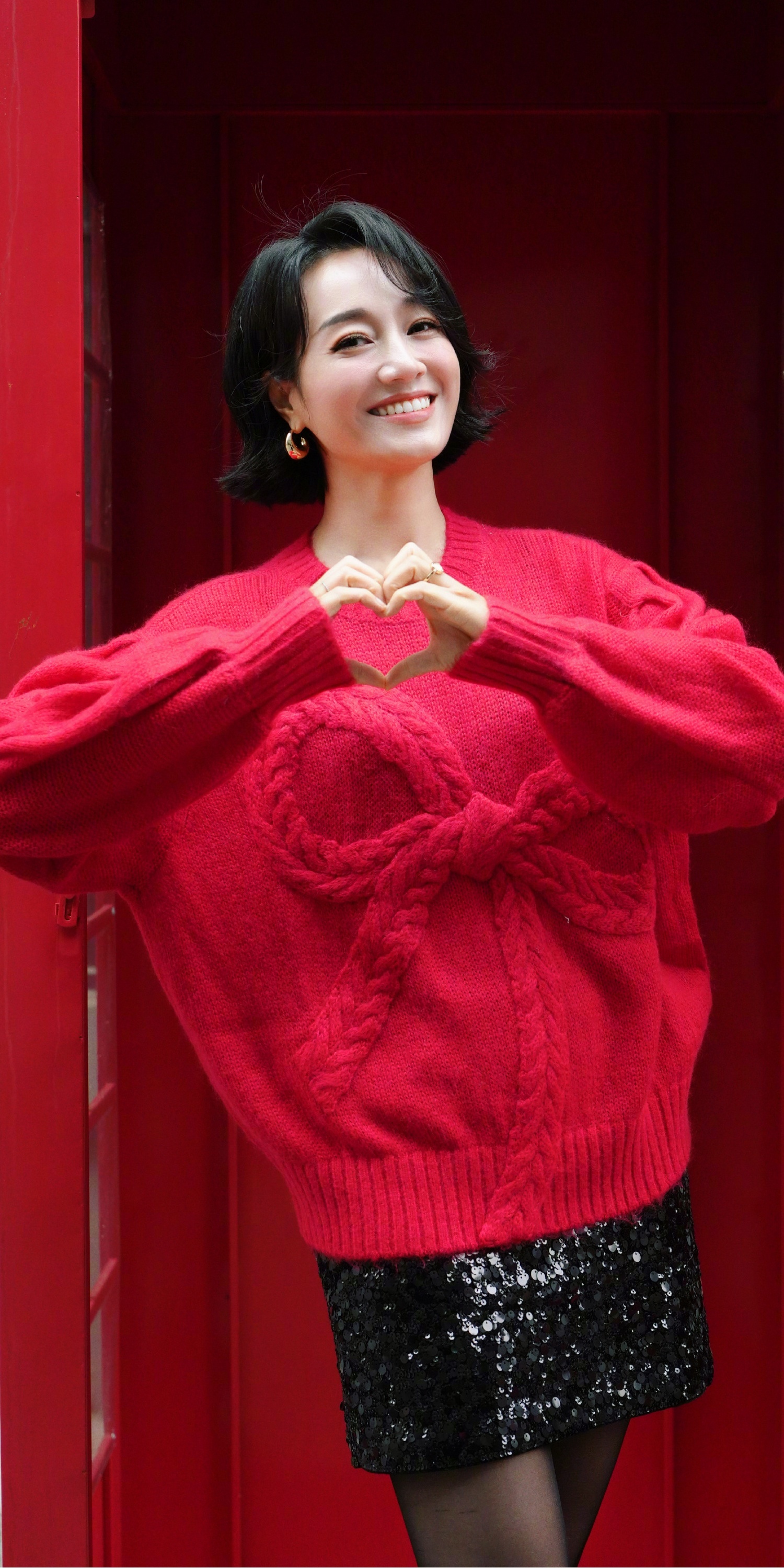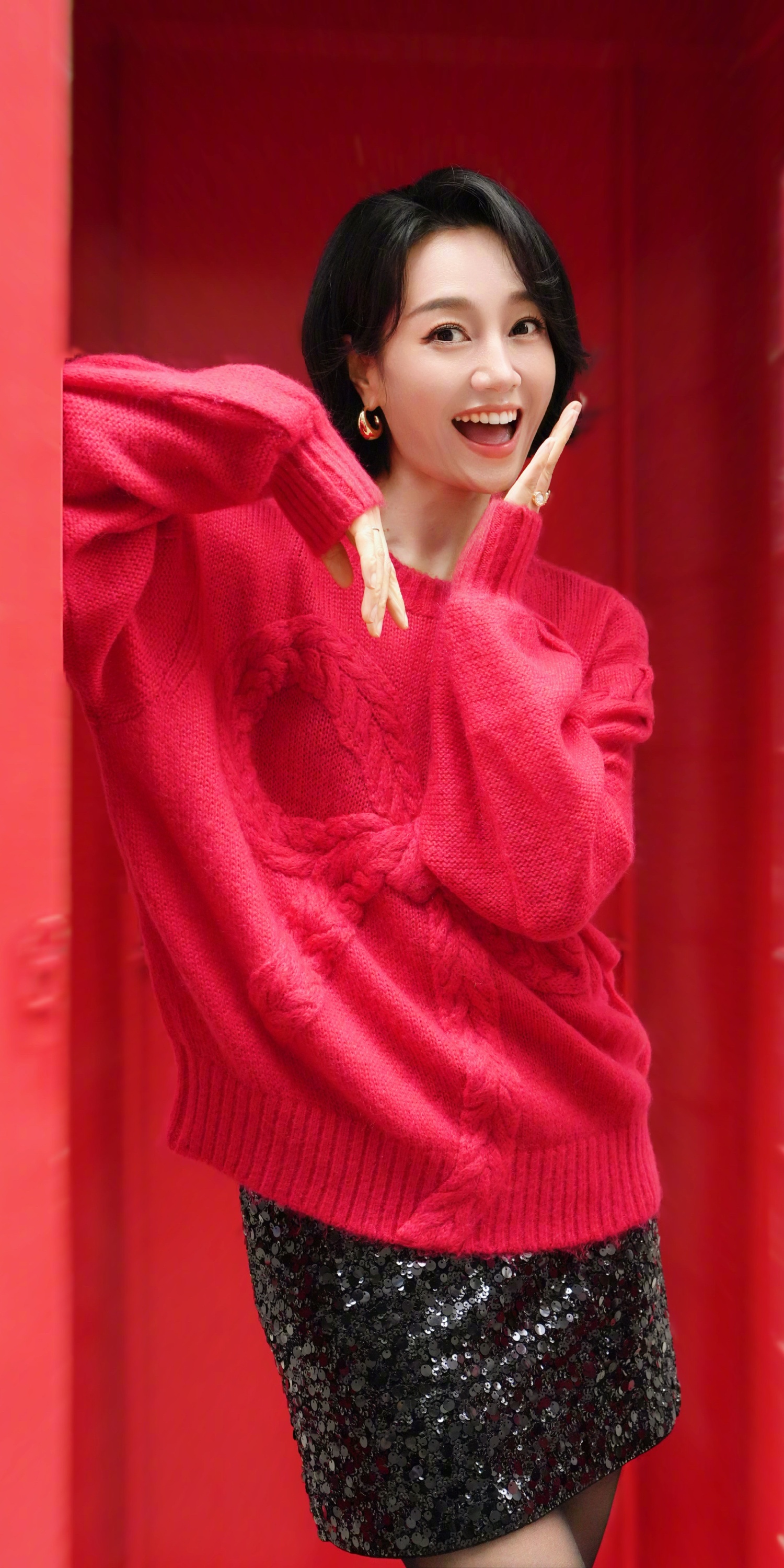 朱丹,红黑色彩穿搭丝袜点缀,喜庆且韵味满满。朱丹