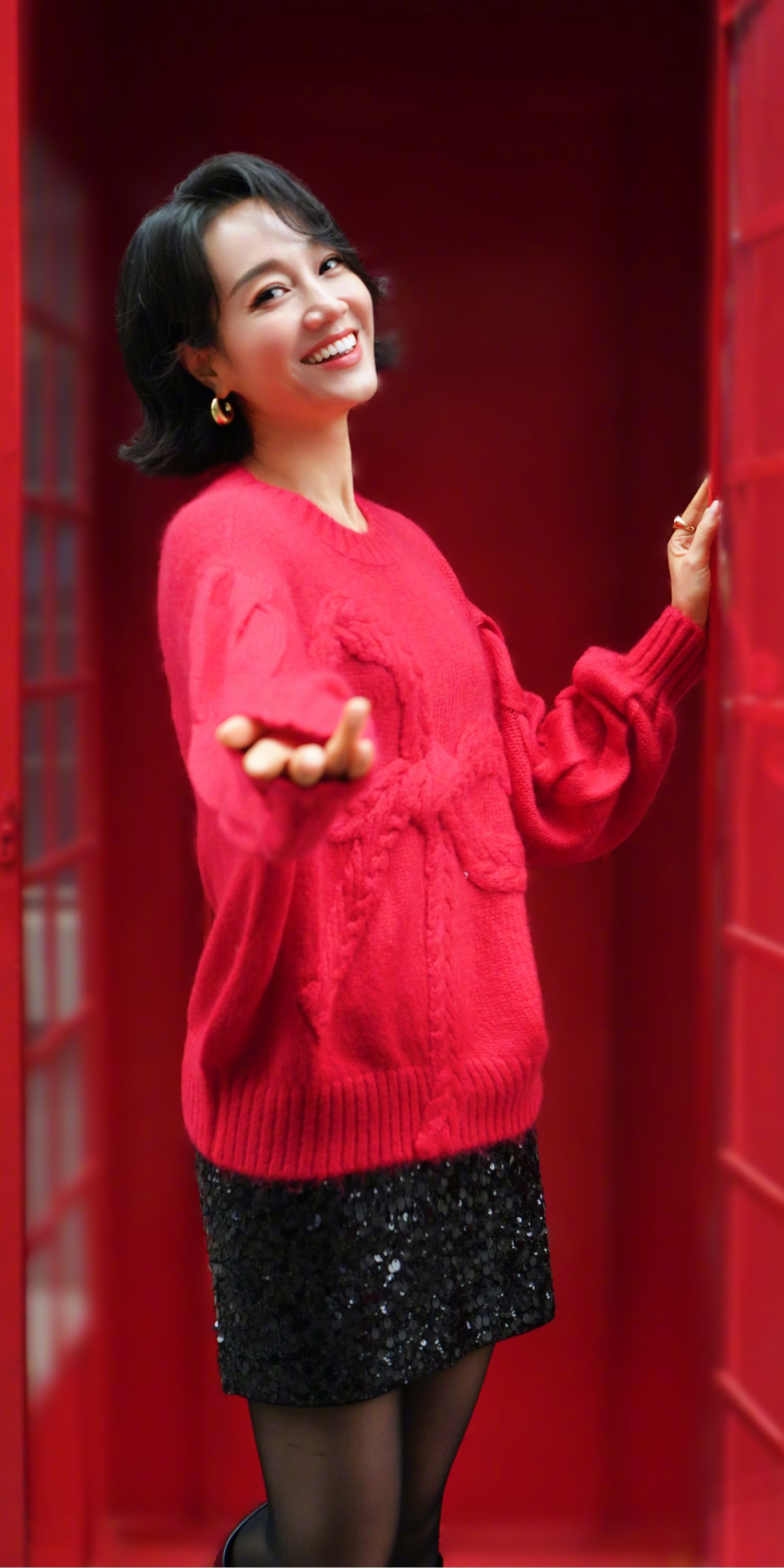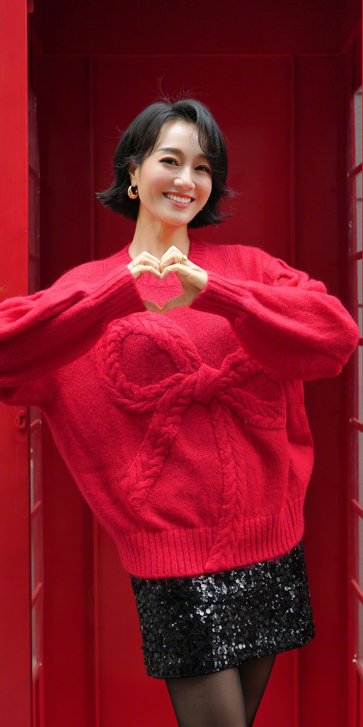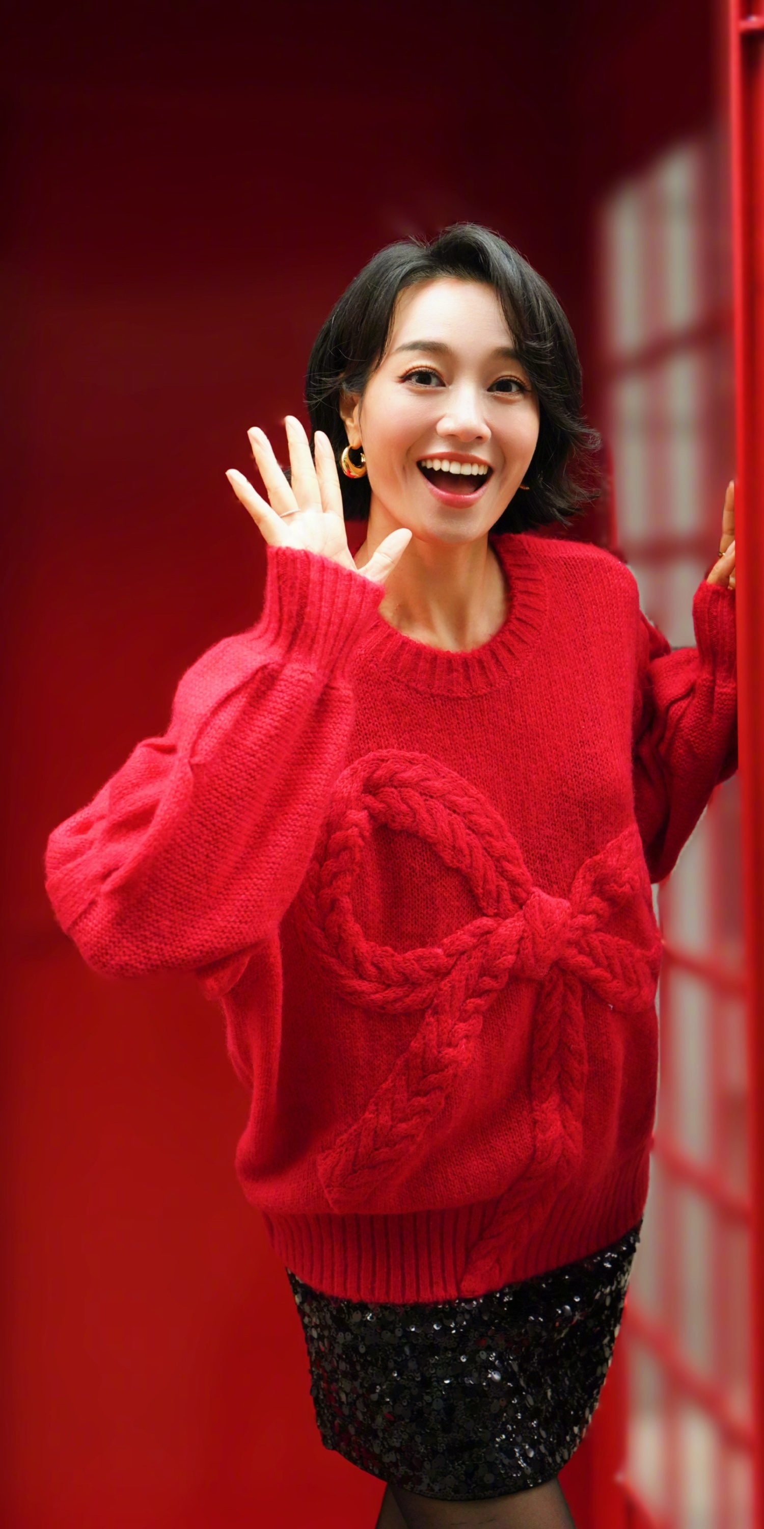 朱丹,红黑色彩穿搭丝袜点缀,喜庆且韵味满满。朱丹