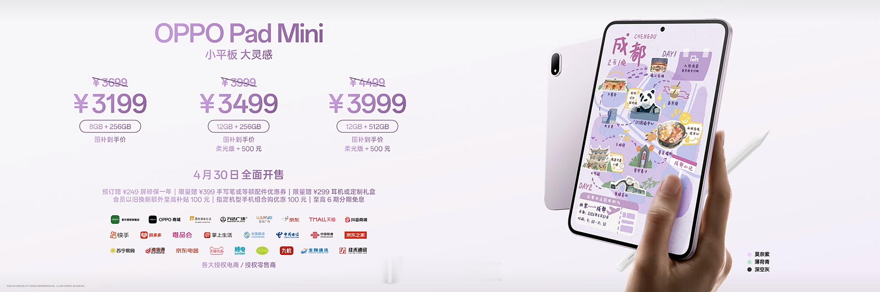 OPPO Pad Mini精致全能旗舰,2026必入平板8+256G:国补后3199元起另有柔光版可选预售开启,4月30日全面开售首销福利购两款平板任意型号,限量赠947元大礼包含OPPO Pencil 3手写笔、Enco R4耳机、一年碎屏保先到先得,赠完即止