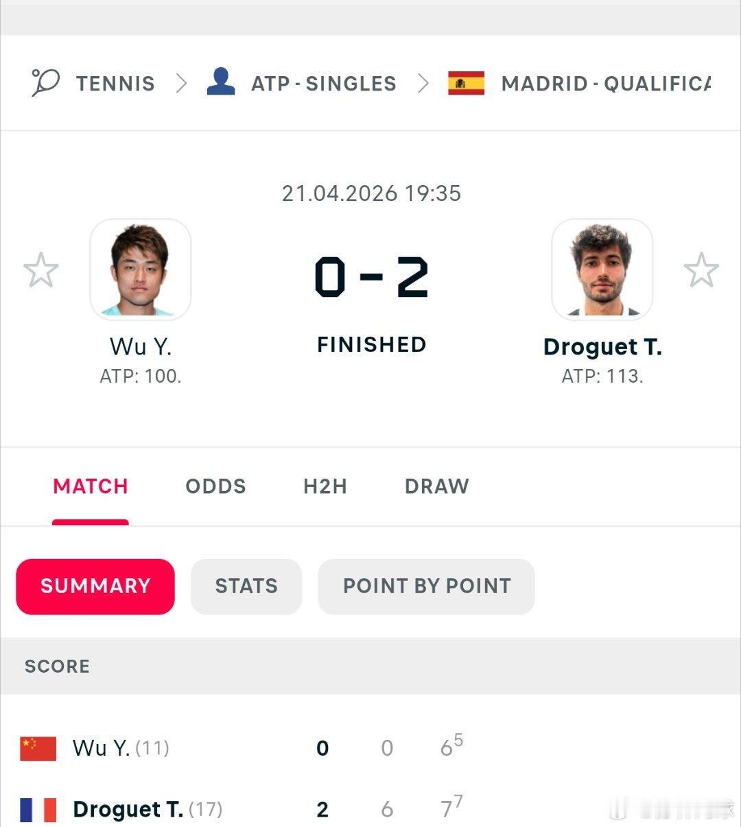 马德里大师赛资格赛次轮🇨🇳吴易昺0-6/6(5)-7德罗盖🇫🇷吞蛋无缘正