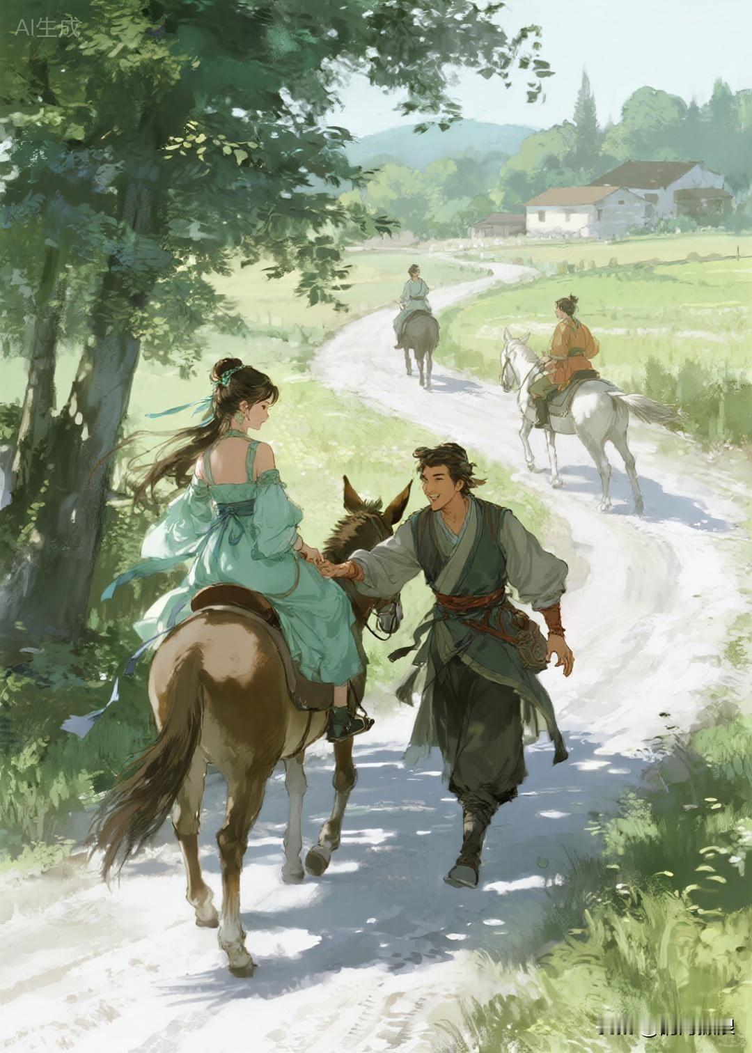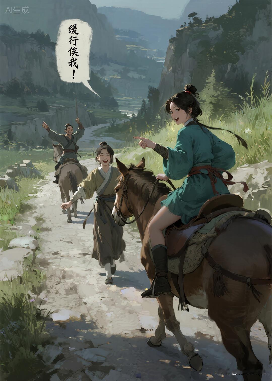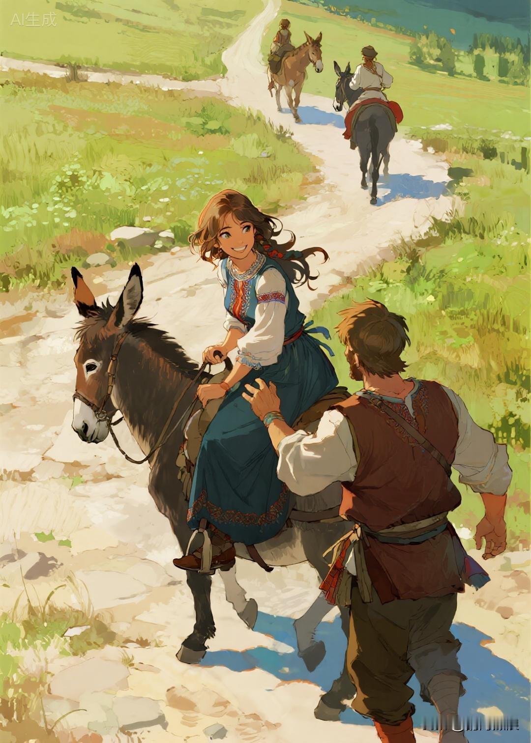 骑了一段路程,其中一名妇人对同伴们说:“唉呀,我要去方便一下,你们骑慢一点在前面等我马上就来。”说罢,将驴缰绳交付同伴手中。