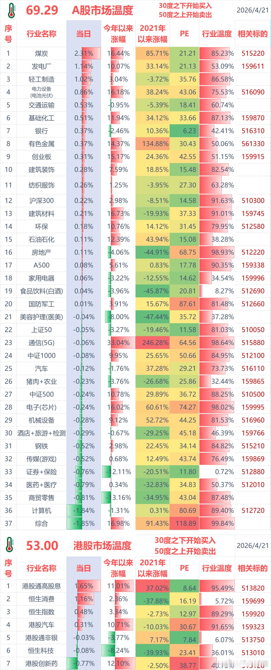 聊几句行情和感受:(1)ETF实盘账户,今天盈利+0.3万;(2)某宝实盘账户,今天盈利+0.8万;(3)两个账户,合计预期盈利+1.1万,预估盈亏比例+0.14%。周一盈利+3.8万,周二盈利+1.1万,今年以来累计盈利+30.5万。今日温度:A股今天69.29度,相比上一个交易日上升+1.2度;港股今天53.00度,相比上一个交易日上升+1.1度;感谢大家的点赞与点爱心~a股基金