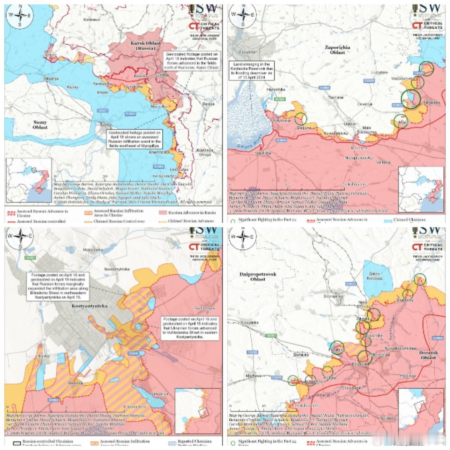 4月18日和19日发布的地理定位视频显示,俄罗斯军队在4月18日和19日于恰西夫亚尔东部(科斯佳季尼夫卡东北部)发动了两次大约连级规模的机械化攻势;