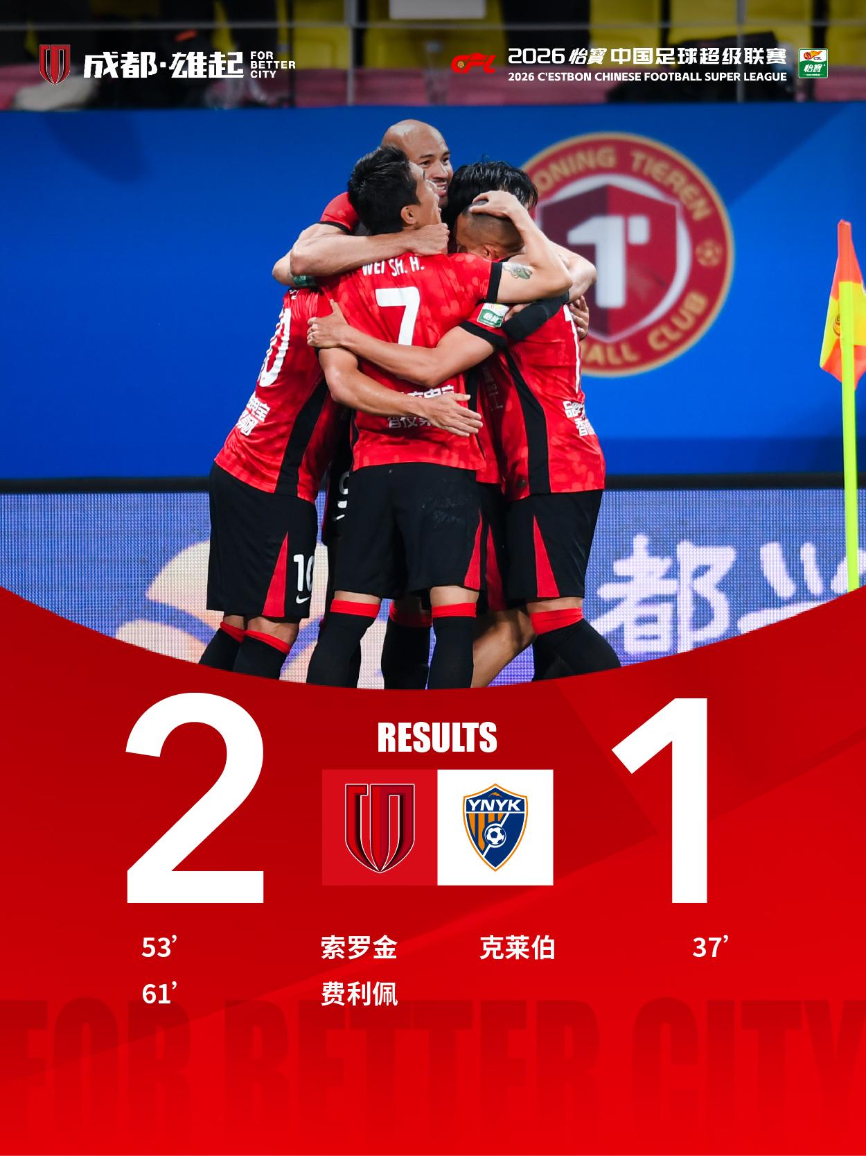 下半场易边再战,贺一然、费利佩悉数登场,双方依旧保持着较高的比赛强度。第53分钟,索罗金禁区内头球吊门得手,成都蓉城扳平比分。随后,韦林顿·席尔瓦助攻费利佩破门,将比分反超!最终,成都蓉城2-1战胜云南玉昆。