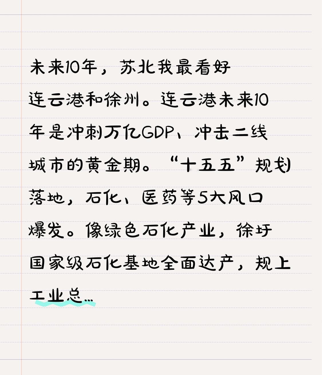 未来10年,苏北我最看好连云港和徐州。 连云港未来10年是冲刺万亿GDP、冲击二