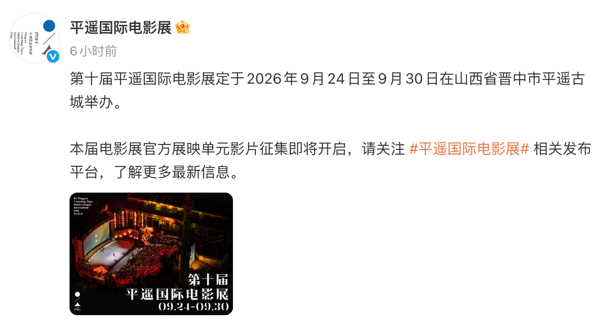 平遥国际电影展宣布举办时间 第十届平遥国际电影展定于2026年9月24日至9月30日在山西省晋中市平遥古城举办。