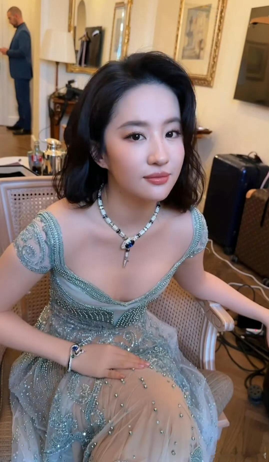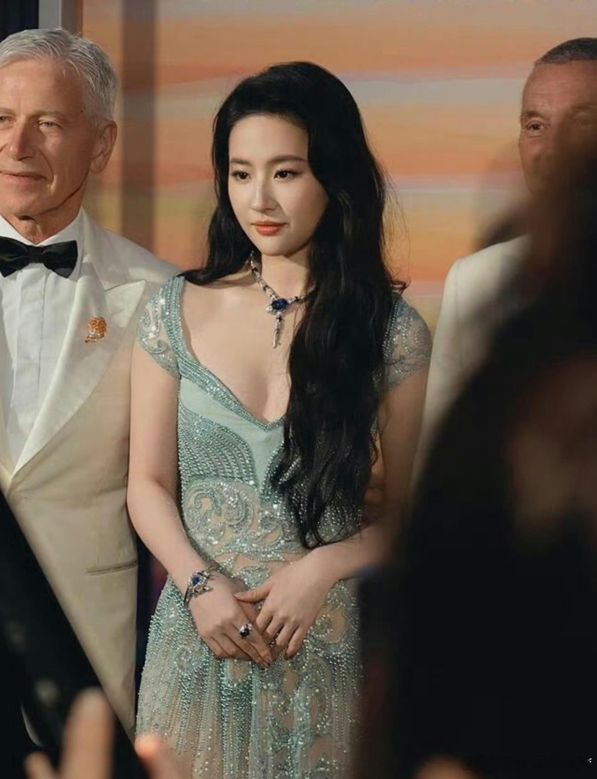 刘亦菲一身清冷雾感的薄荷绿重工钉珠礼裙,低胸方领设计完美勾勒出温柔肩颈线条,短袖蕾丝透视袖则自带朦胧氛围感。
