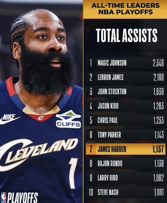 哈登季后赛总助攻数提升到1139次,超越隆多季后赛1136次助攻,升至NBA季后赛历史助攻榜第7位。