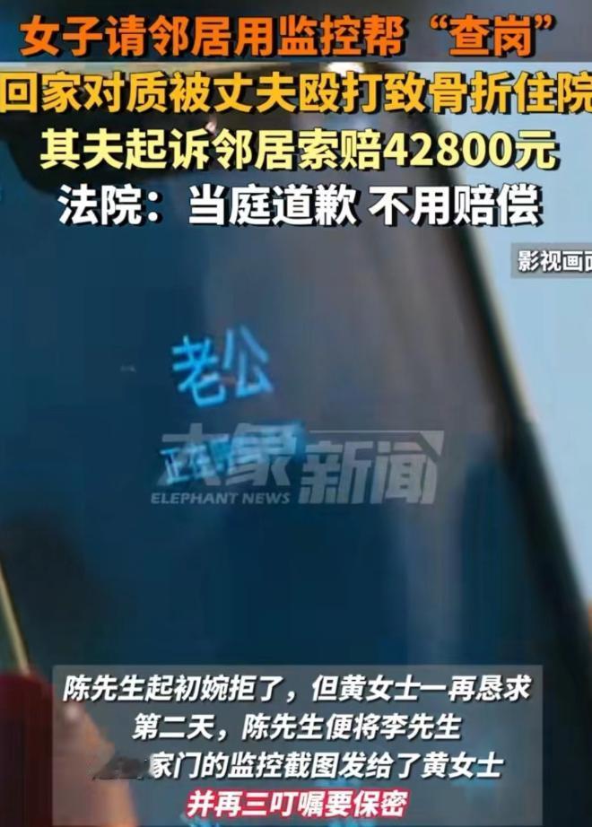 2025年,江苏扬州,女子怀疑丈夫背叛她,看到邻居家有监控,可以看到她家的停车位,她就要求邻居帮忙查她丈夫的行踪,邻居拒绝了,可她一而再再而三地恳求邻居,邻居要她保密之后,这才截图给她,不料她回去拿着截图和丈夫争执,她被丈夫打成骨折,然后她丈夫起诉了邻居,要求赔偿42,800元。