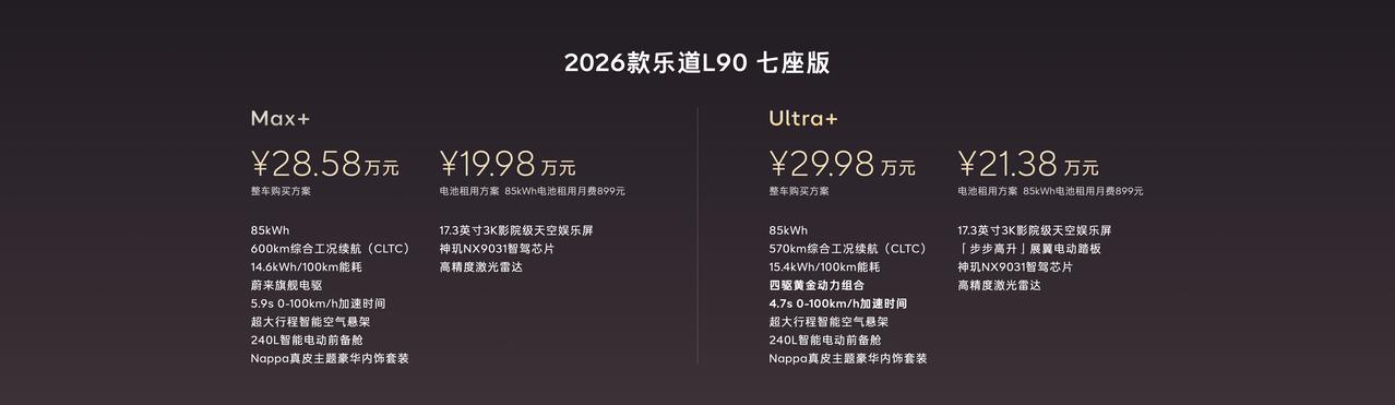 【租电后售17.98万起,2026款乐道L90正式上市】4月21日,2026款乐道L90正式上市,共推出5款配置,整车购买价区间为26.58万-29.98万元,租电版本售价17.98万-21.38万元。作为年代改款车型,该车沿用家族式设计,配备“星路闪耀”智慧交互像素大灯,支持多种灯语及ADB自适应功能。尺寸方面,其长宽高分别为5145/1998/1786mm,轴距3110mm,新增紫金、银紫两款双拼色可选。此外,新车保留240L容量前备舱,全系标配外后视镜智驾小蓝灯。内饰方面,新车提供六座/七座布局可选,座椅采用Nappa真皮包裹,配备17.3英寸3K吸顶屏、8英寸后排屏、8.86L车载冰箱等配置。同时,该车新增激光雷达版本车型,将搭载蔚来ES9同款神玑NX9031智驾芯片、蔚来世界模型智驾系统及SkyOS天枢整车全域操作系统。动力方面,单电机后驱车型最大功率340kW,0-100km/h加速时间5.9秒;双电机四驱版最大功率440kW,0-100km/h加速时间4.1秒。全系标配85kWh电池,两驱版CLTC续航605km,四驱版CLTC续航570km;采用900V高压架构,快充25分钟可将电量从10%充至80%,兼容蔚来第三/第四代换电站,3分钟即可完成换电。【来自懂车帝车友圈】
