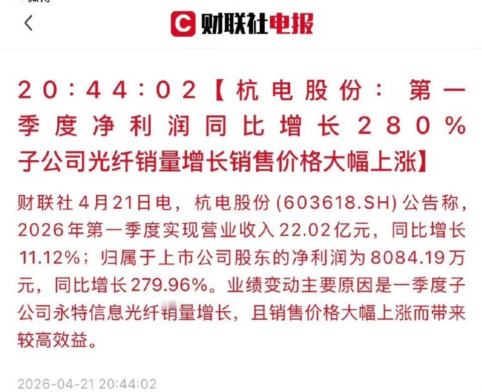 杭电股份:第一季度净利润同比增长280% 子公司光纤销量增长销售价格大幅上涨