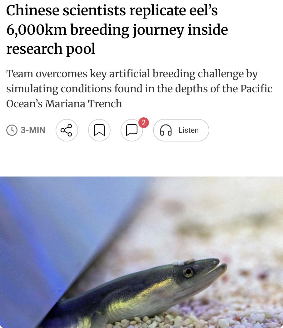 外媒:中国科学家在实验室水池内成功复刻了鳗鱼6000公里的繁殖洄游全过程,攻克了人工繁育难题。