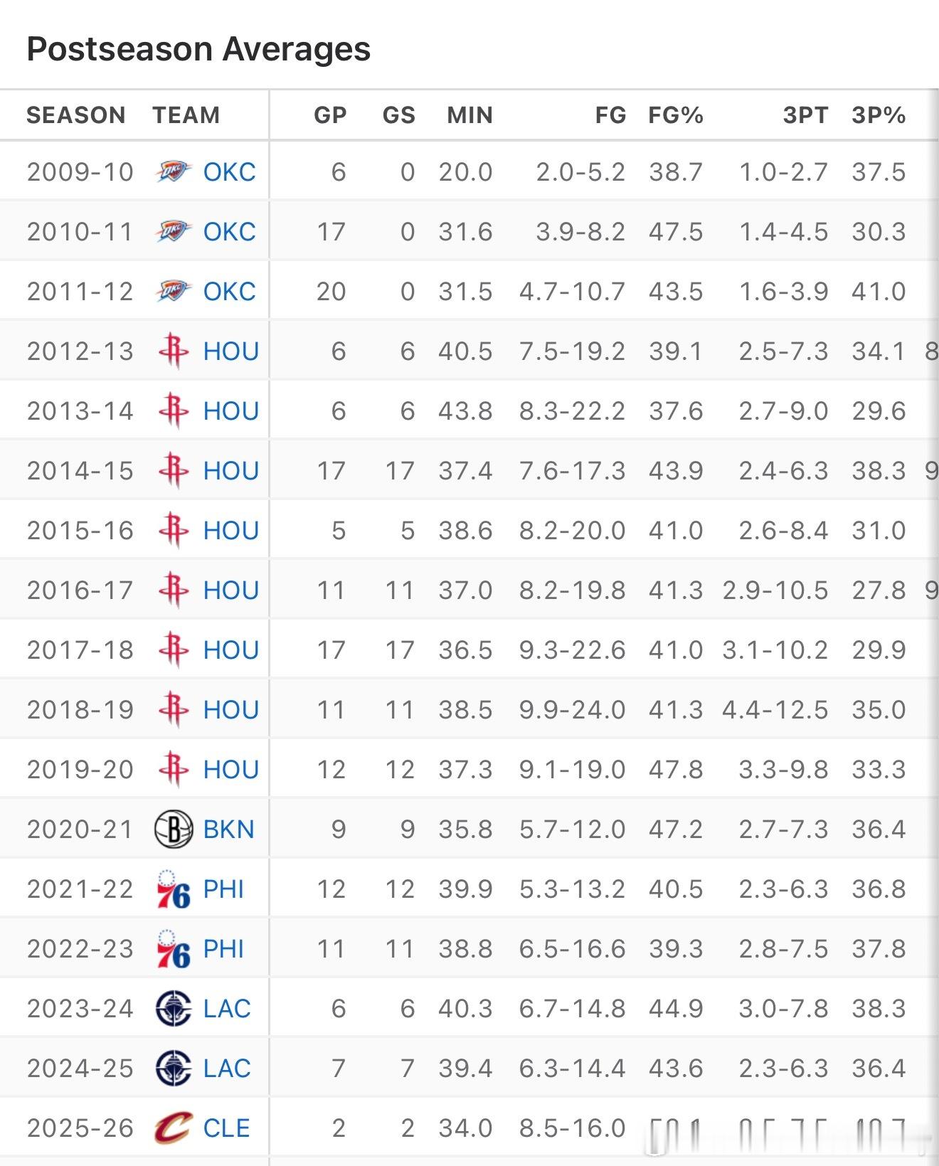 哈登自 2021年以来 的季后赛场均上场时间是:2021-22(76人):39.9分钟2022-23(76人):38.8分钟2023-24(快船):40.3分钟2024-25(快船):39.4分钟