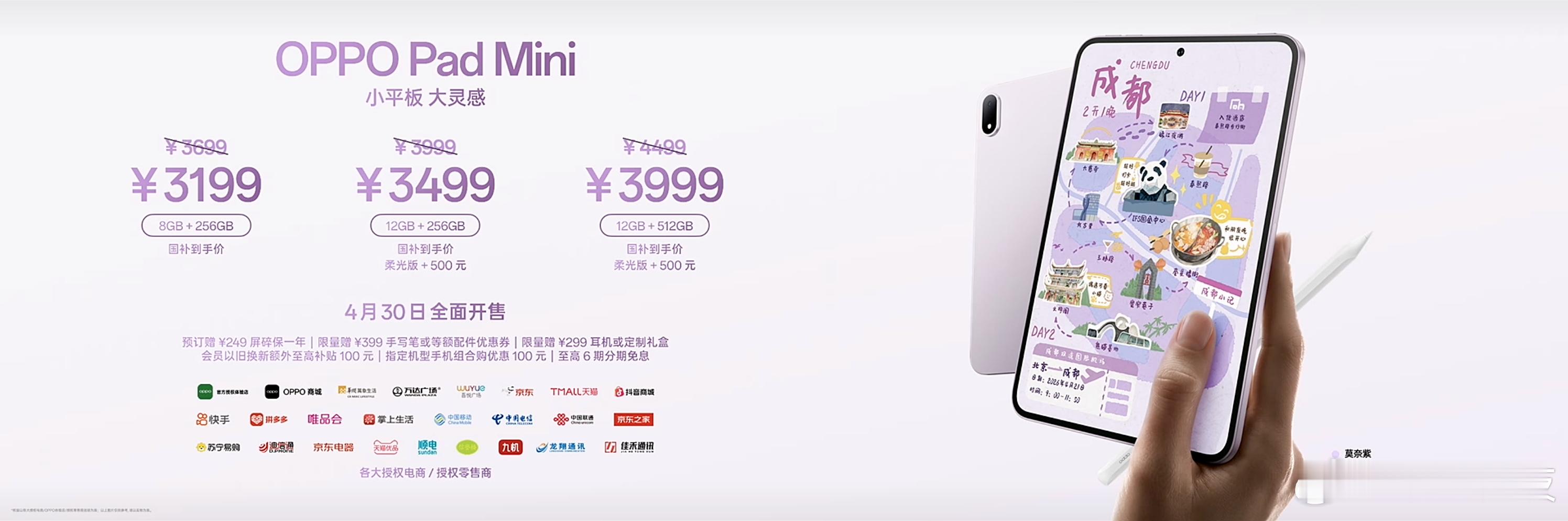 OPPO Pad Mini:8GB+256GB售价3699元12GB+256GB售价3999元12GB+512GB售价4499柔光版+500元