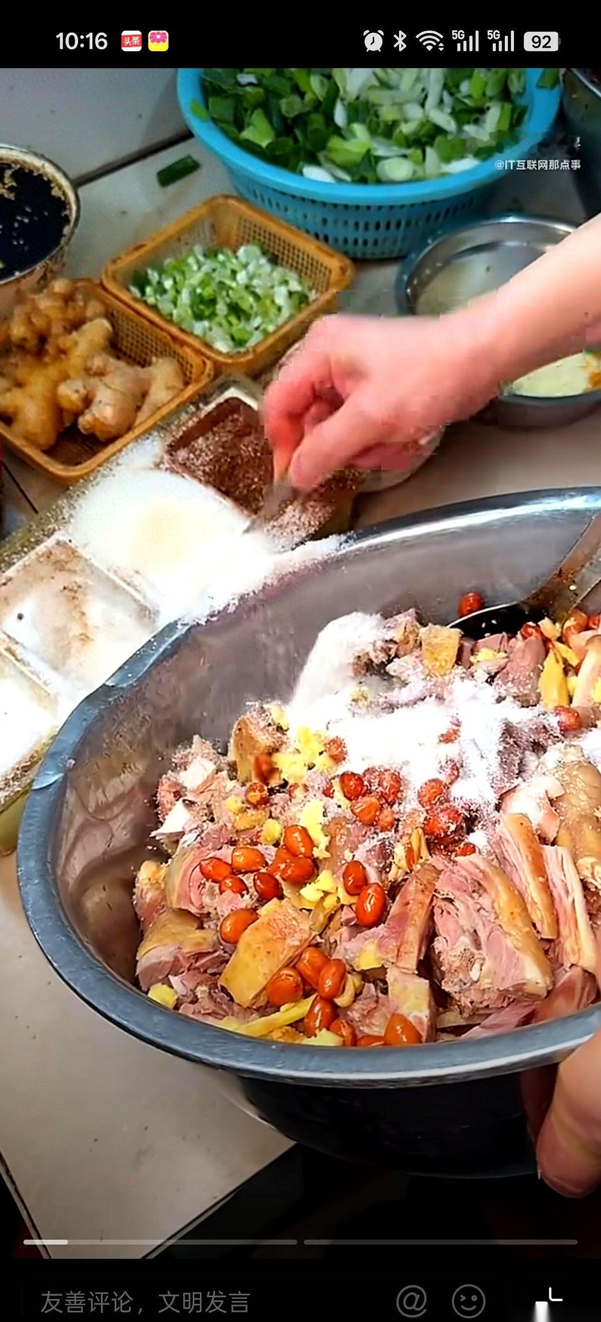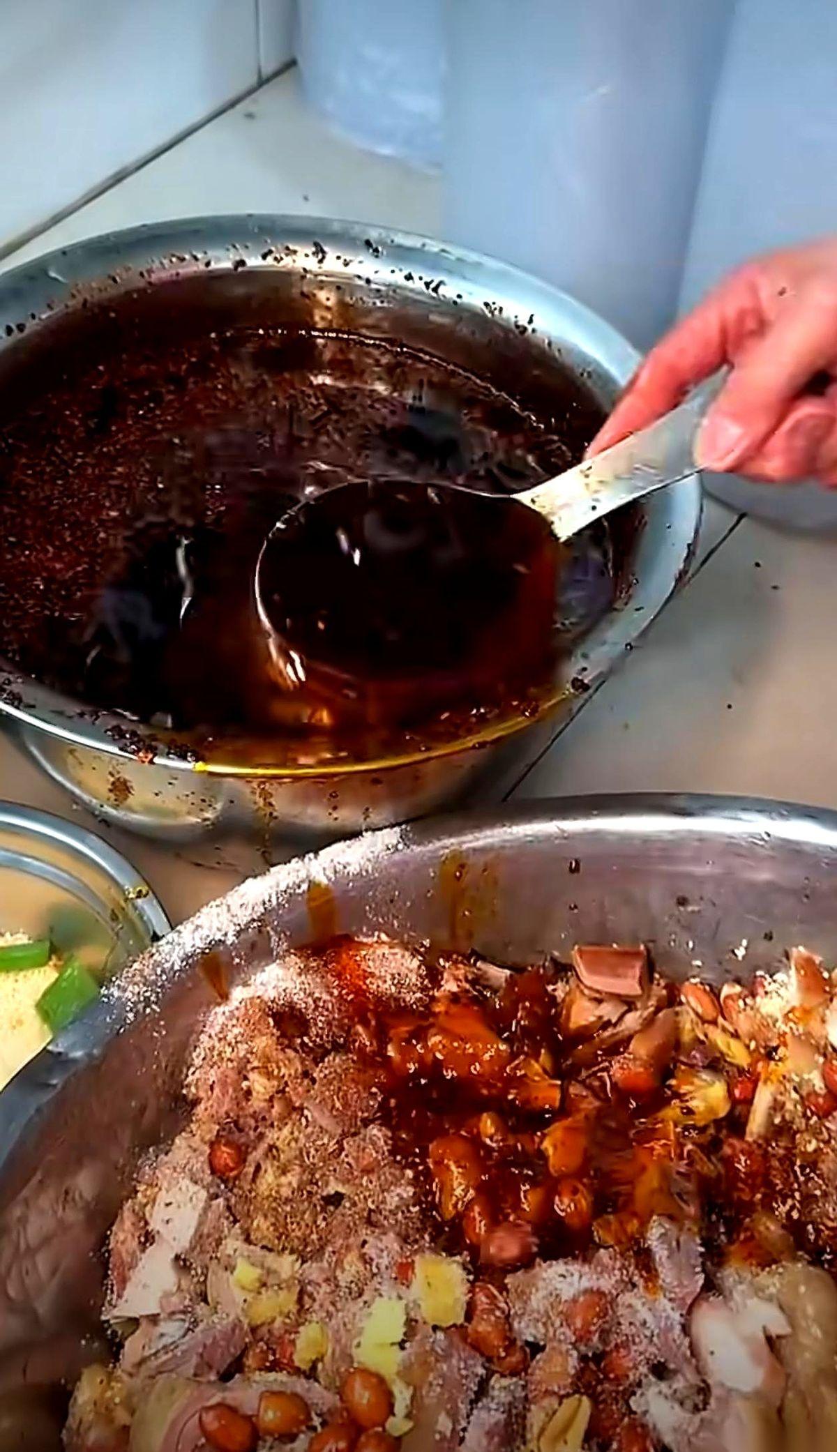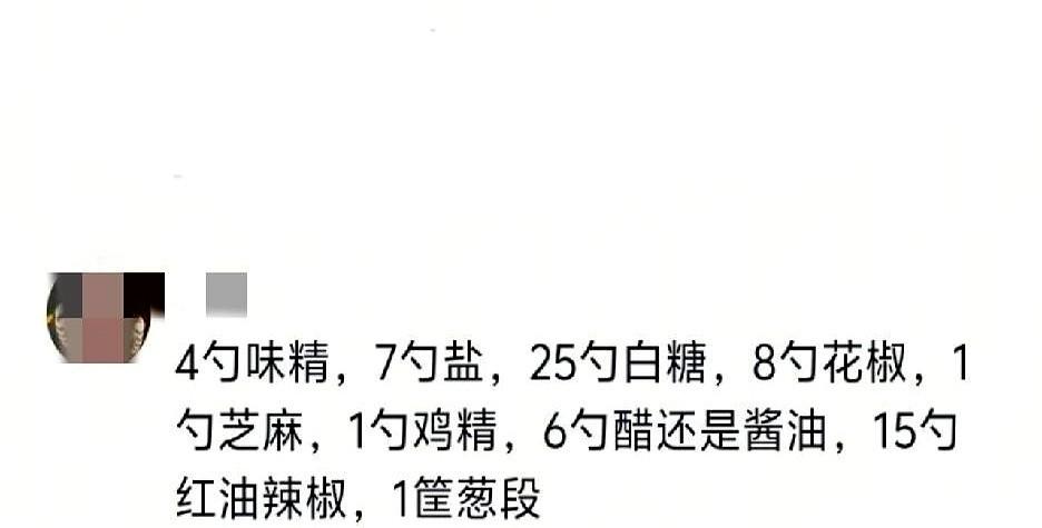 一勺、两勺……白糖整整撒进去25勺,在盆里堆起了一座亮晶晶的小山。接着是4勺味精、7勺盐、8勺花椒,最后大半筐葱段直接倒扣进去。红油辣椒像不要钱一样往里瓢,整整15大勺。