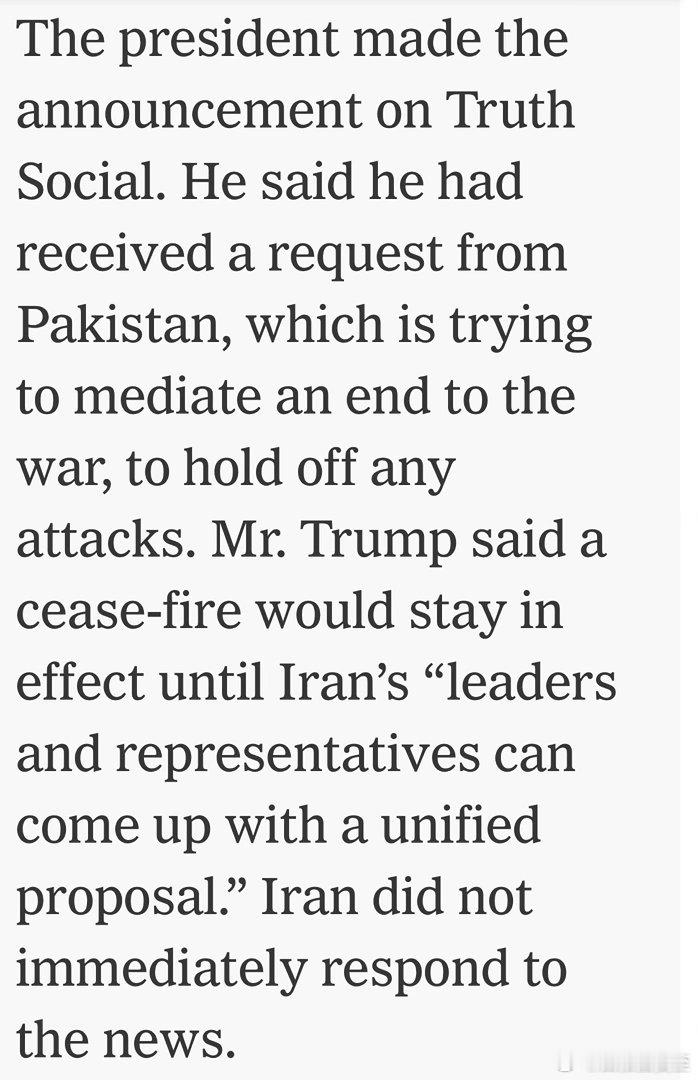 Trump宣布:停火延期号称是“应巴基斯坦的要求”没给新的期限,只说“直到伊朗内
