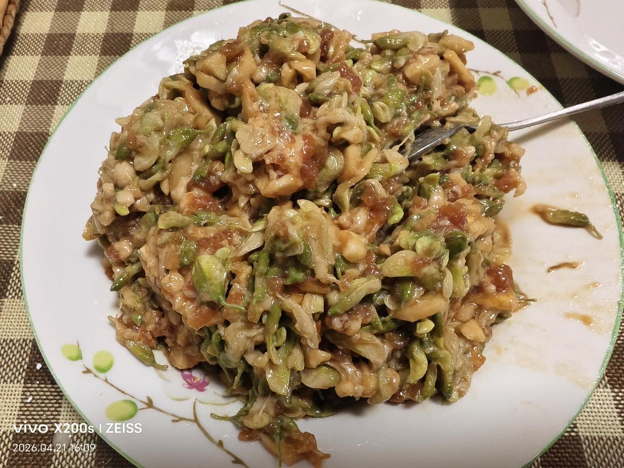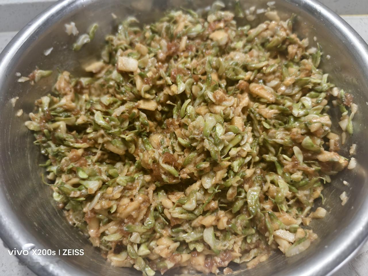回家之后我用淡盐水浸泡一会进行杀菌消毒,然后用自来水清洗几次,放入开水中快速焯水,捞出后放入凉水中,最后挤干水分与五花肉搭配,加入爱吃的调料做成家人们爱吃的饺子馅。