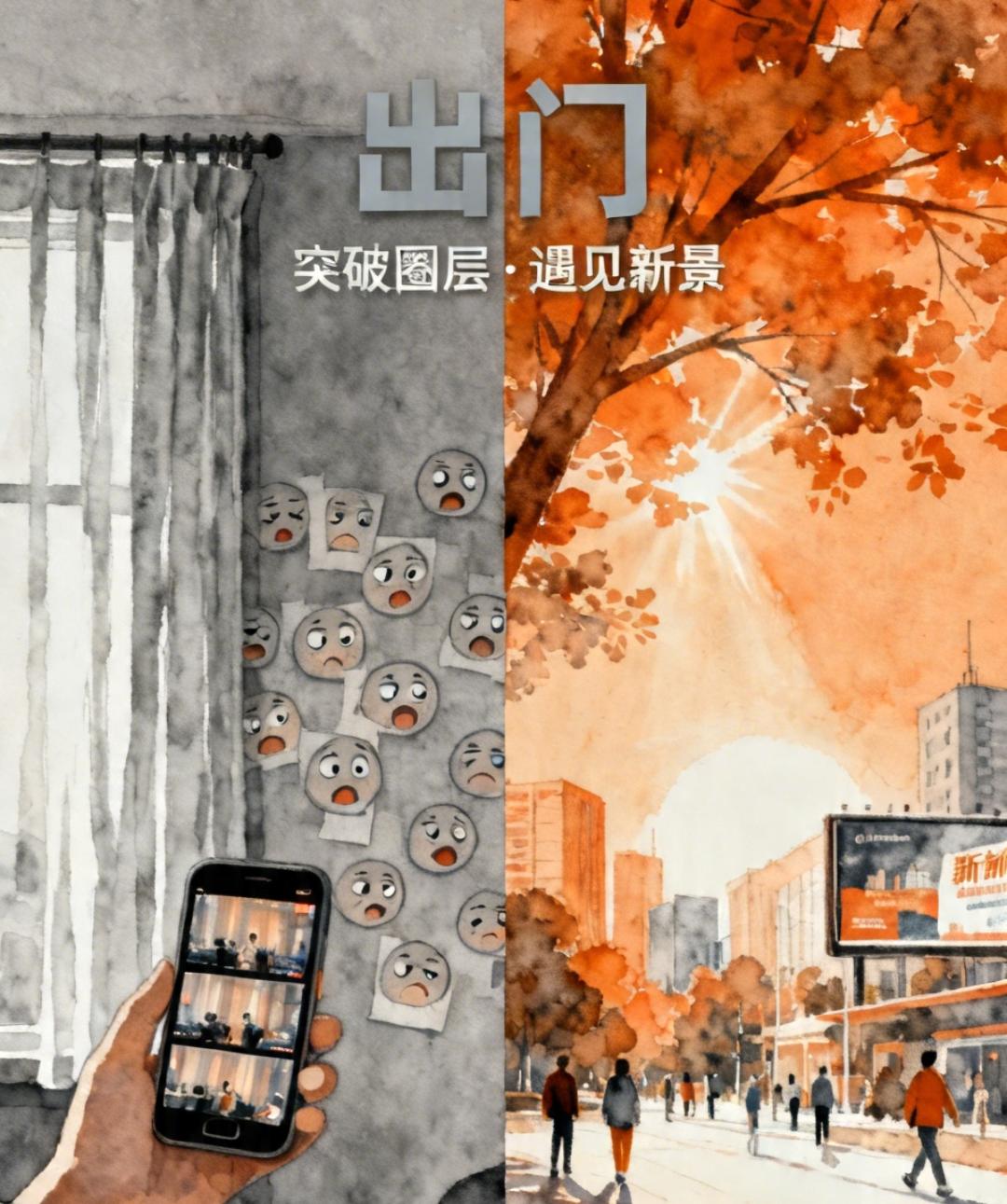 不出门,就只能困在固定的圈子里,刷着重复的视频,想着同样的烦恼,眼界越来越窄,情绪也容易陷在低落里。