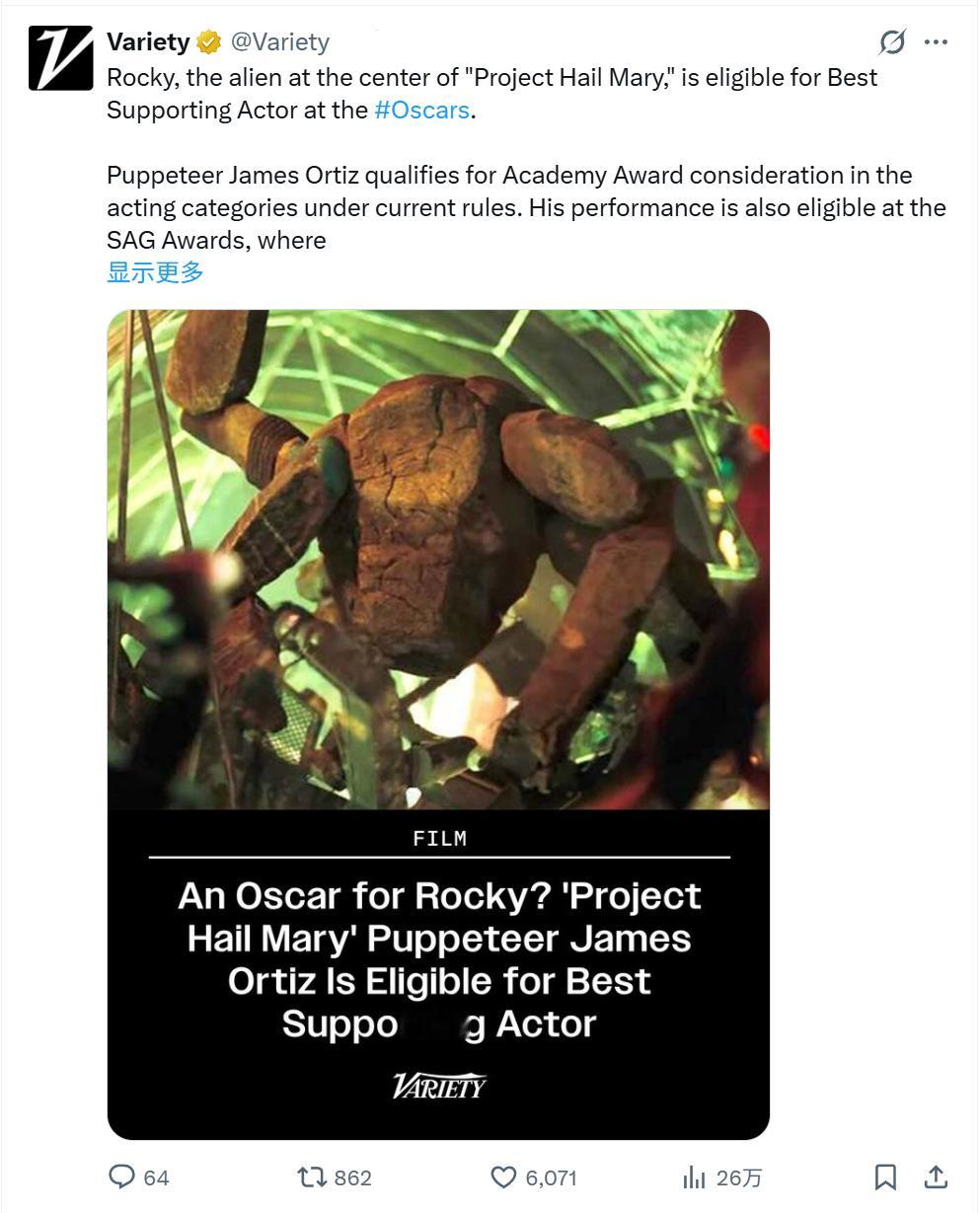 《挽救计划》里的外星形象Rocky不仅成为外界瞩目的年度爆款角色,目前也已经被制片厂安排参与颁奖季角逐,并引发了很有意思的话题:木偶/动作捕捉/声音结合的表演,算不算是真正的“演技”?