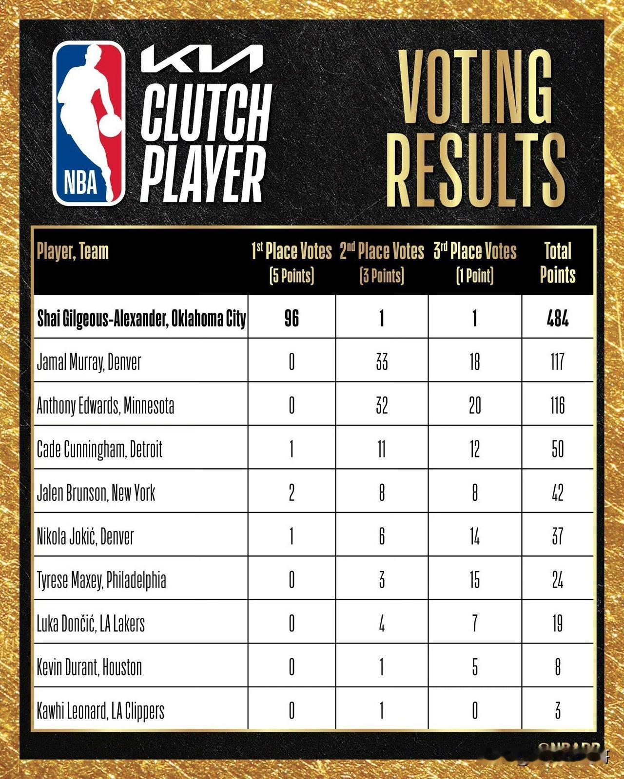 遥遥领先!!!亚历山大96票当选赛季最佳关键球员,实至名归!