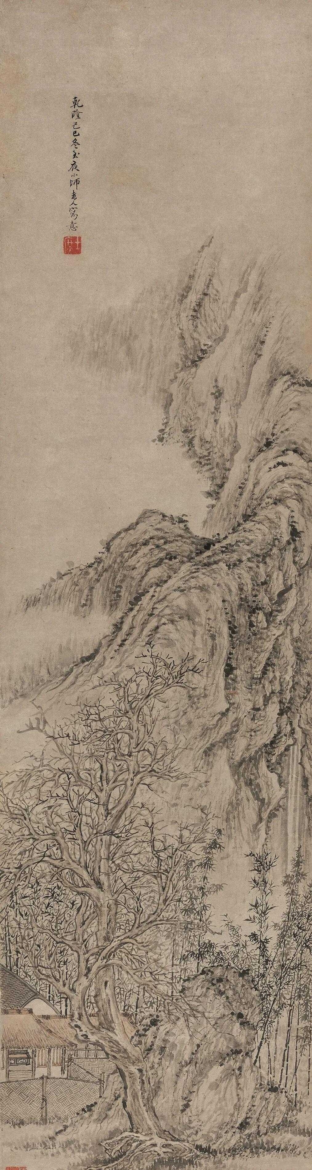 方士庶《枯枝茅庐图》,镜心 设色纸本 127×33.5 cm。钤 印:士庶、偶然拾得。题识:乾隆己巳冬至夜,小师老人写意。方士庶(1692—1751)字循远,一作洵远,号环山,又号小狮道人,一作小师道人,新安(今安徽歙县)籍,家维扬(今江苏扬州)。清代画家。这就是中国风遇见艺术