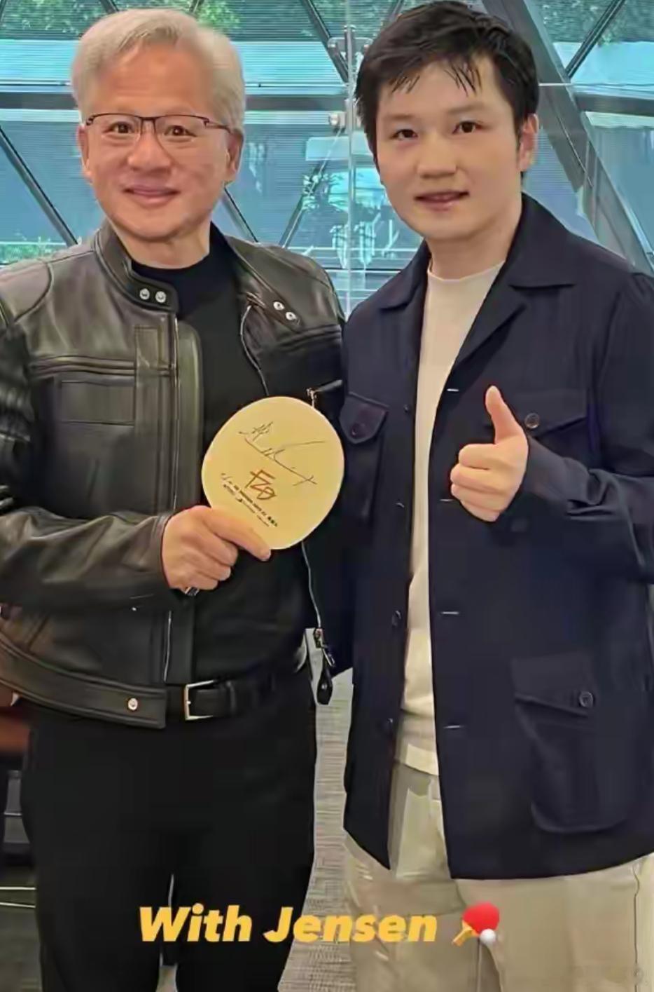 樊振东与英伟达创始人打乒乓球 樊振东硅谷跨界切磋!与英伟达创始人黄仁勋对战乒乓球4月21日,乒乓球奥运冠军樊振东现身美国硅谷,以MLTT美职乒联赛战略投资人身份到访英伟达总部,与英伟达创始人黄仁勋开展乒乓球友谊切磋。黄仁勋是资深乒乓爱好者,年少曾拿下全美乒乓球公开赛青年组双打季军,打球功底扎实。现场两人多回合对拉切磋,从合影汗迹、运动状态能看出实战互动充分。樊振东展现世界顶级控球功底,双方以球会友氛围轻松。交流尾声,樊振东向黄仁勋赠送亲笔签名球拍,完成体育与科技跨界互动。此次会面同时围绕乒乓运动推广、科技赋能体育展开交流,成为体育圈与科技圈热门联动话题。