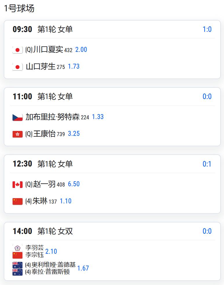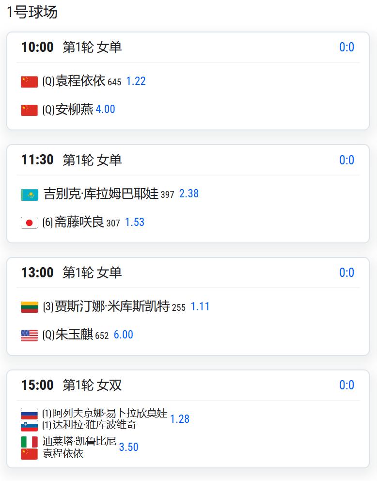 4号种子朱琳将对阵资格赛球员赵一羽;