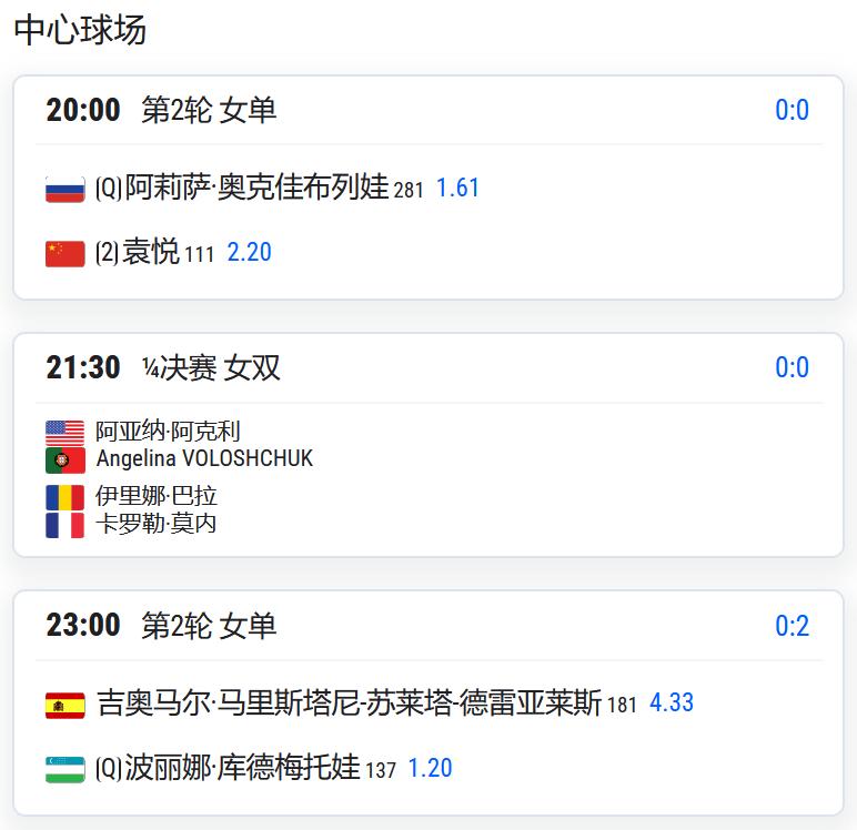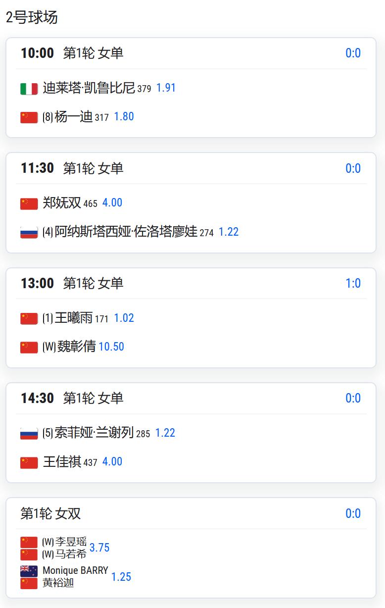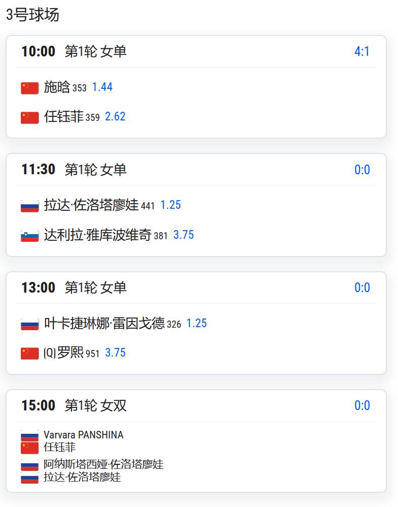 任钰菲搭档帕什娜对阵佐洛塔廖娃姐妹。