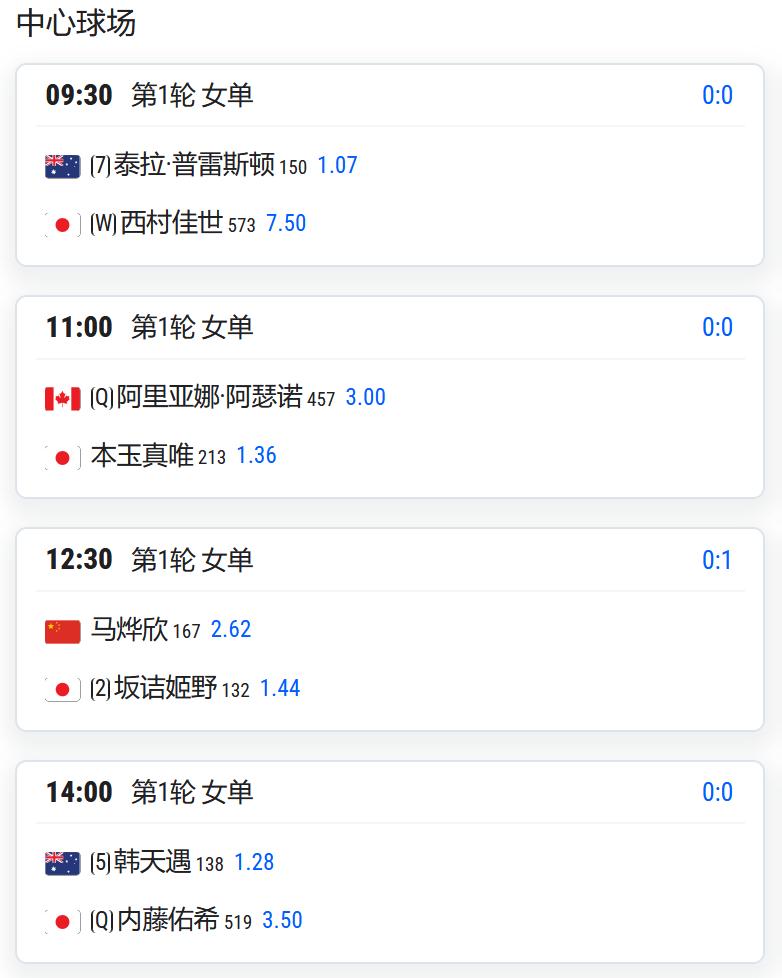 W100东京,女单第一轮,马烨欣将对阵2号种子坂诘姬野;