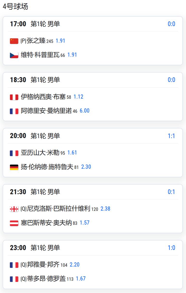 男单第一轮,用保护排名出战的张之臻将对阵捷克球员科普里瓦;