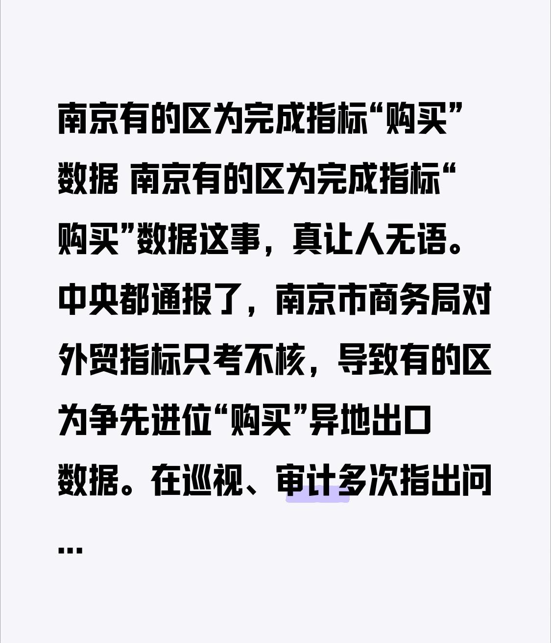南京有的区为完成指标“购买”数据 南京江宁区为完成指标“购买”数据这事,真让人无语。中央都通报了,南京市商务局对外贸指标只考不核,导致“有的区”为争先进位“购买”异地出口数据。在巡视、审计多次指出问题,预警都发了,监管还是不力,整改也是走过场。