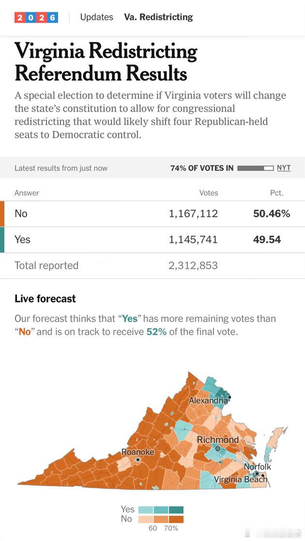Virginia州特别选举:修改州宪法,允许民主党控制的州议会重划选区图目前已数
