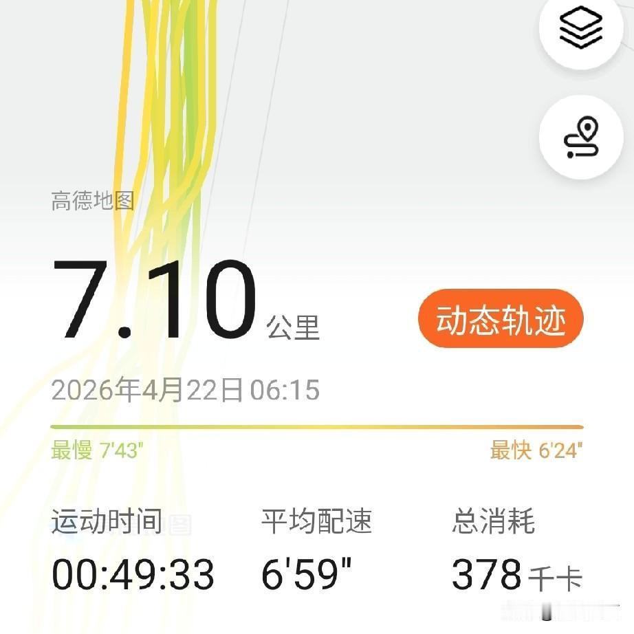 7公里跑下来,平均配速当然也比昨天低。理智上来了,还是得结束跑步,走回现实。