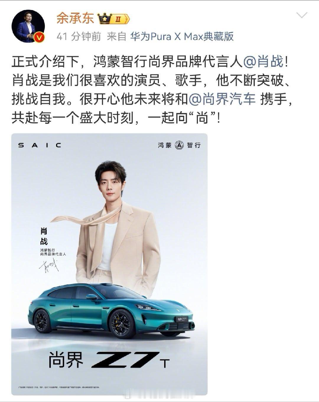 余承东官宣肖战尚界品牌代言人 果然肖战,尚界Z7/Z7T女车主比例应该会很高吧。