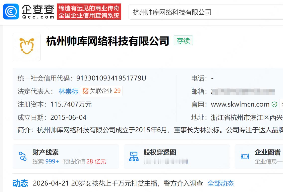 企查查APP显示,涉事主播所属MCN为杭州帅库网络科技有限公司,该公司成立于2015年6月,注册资本约115.7万元,经营范围包含演出经纪业务、计算机技术研发、服装、服饰的设计、研发等,由福建网龙计算机网络信息技术有限公司、林崇标等共同持股。