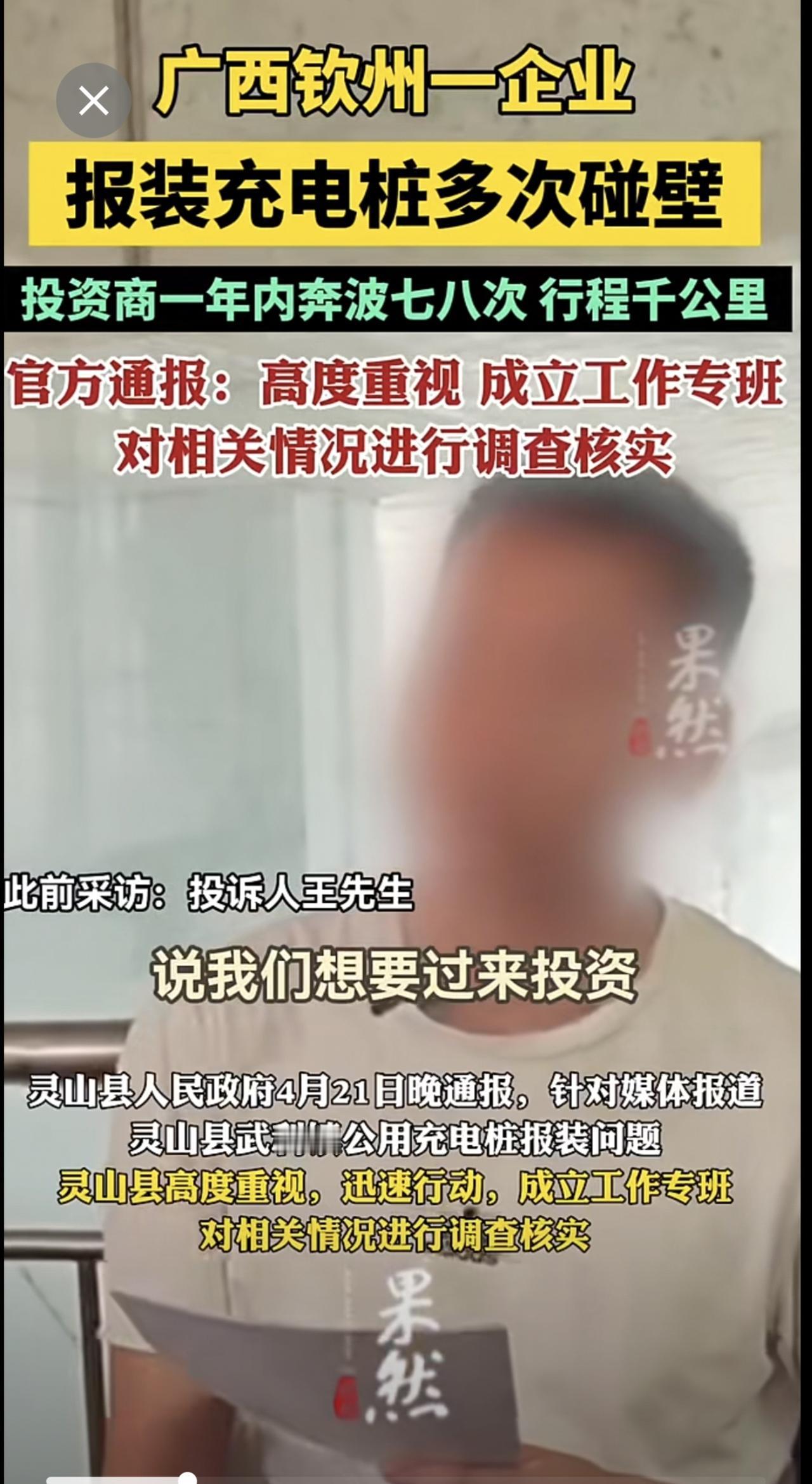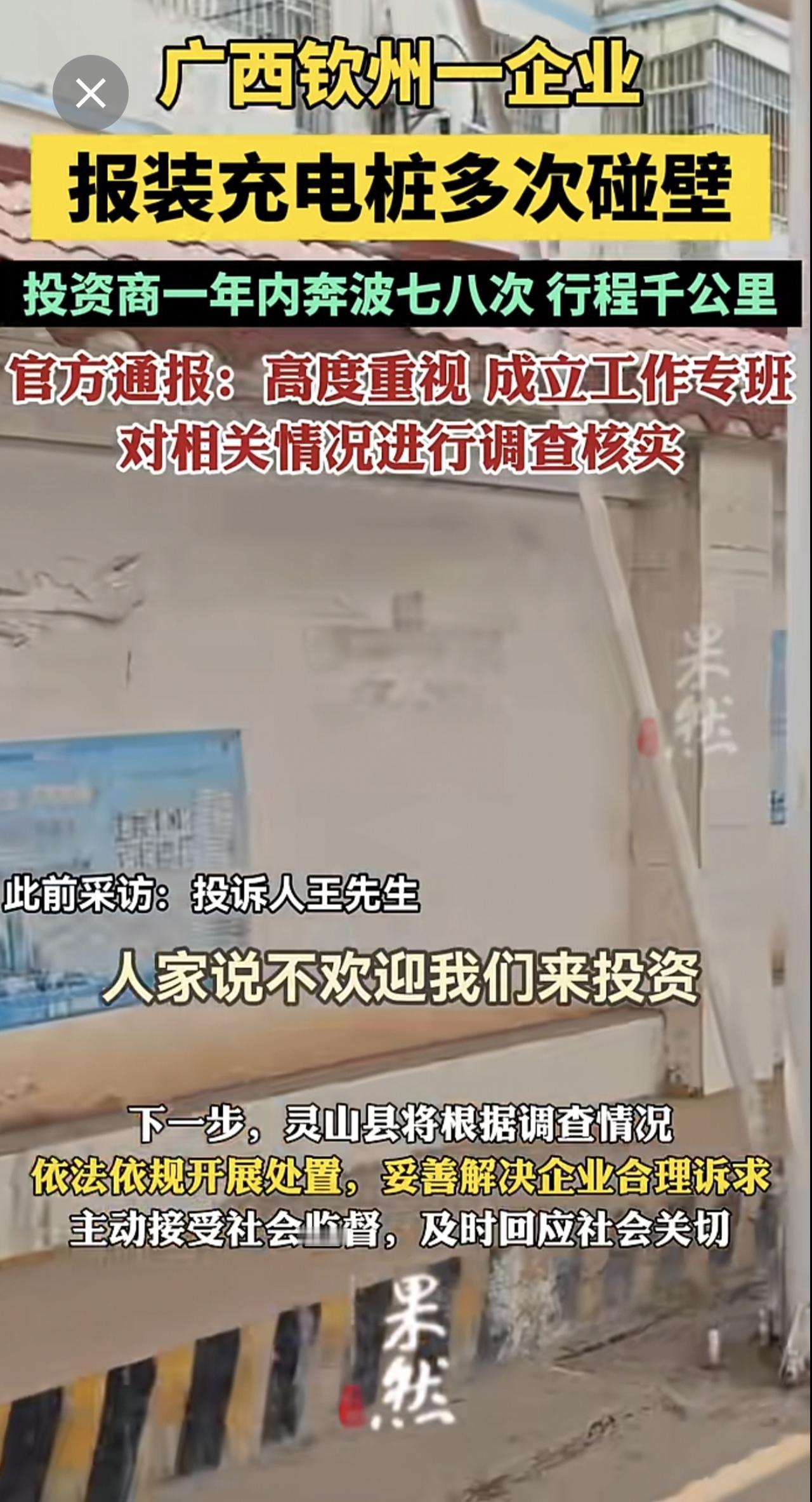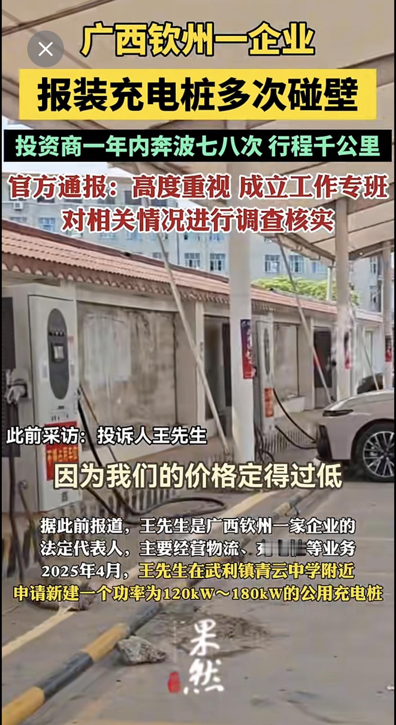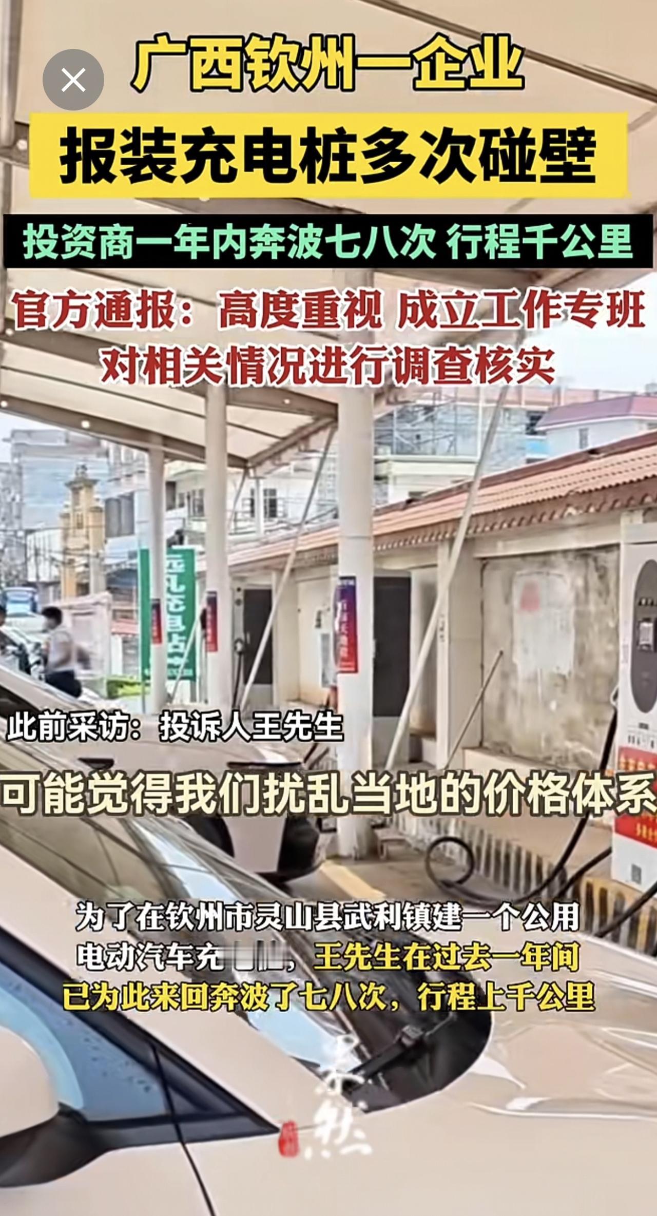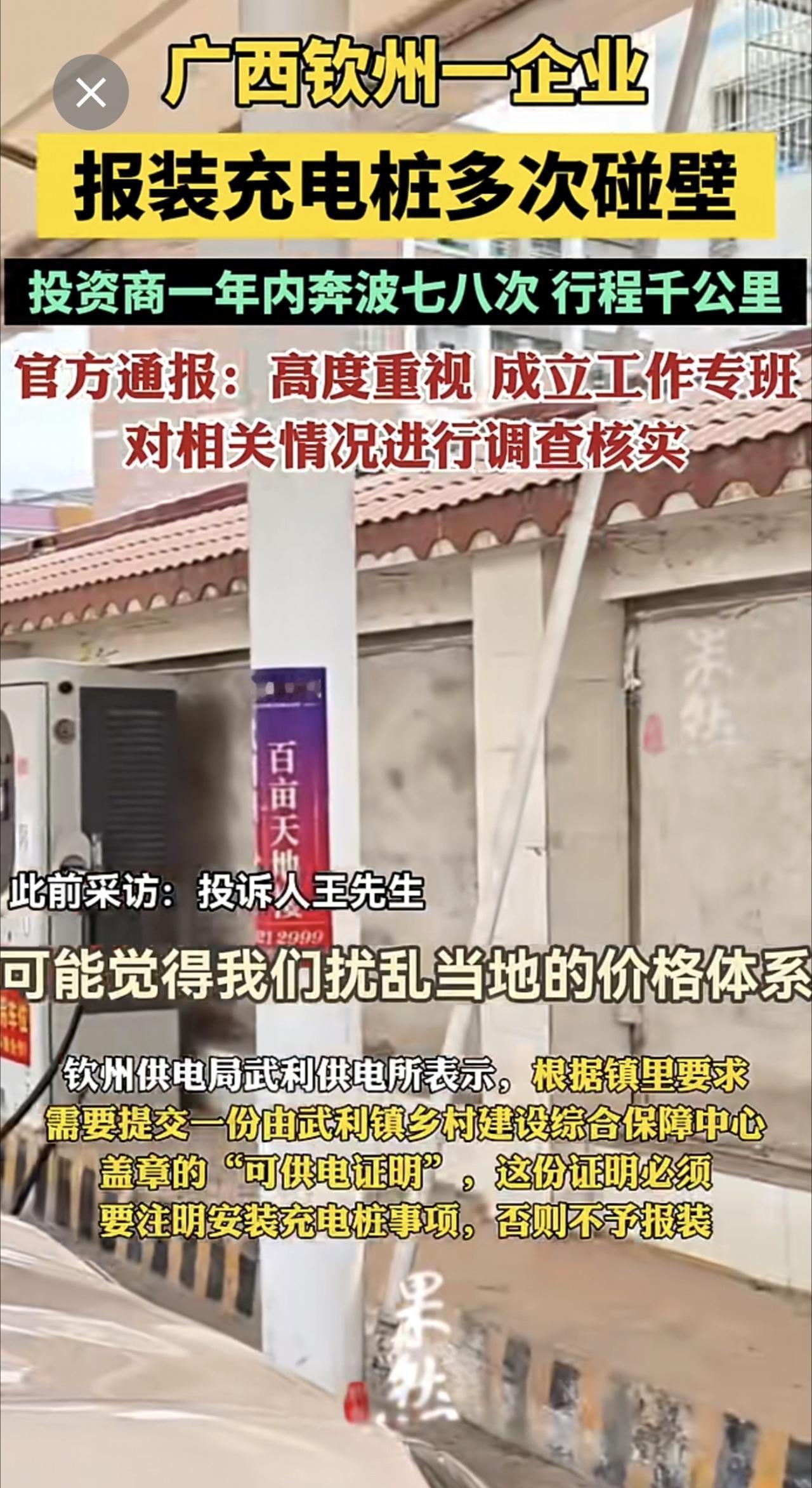 广西钦州一企业报装充电桩多次碰壁,官方通报:高度重视,成立工作专班对相关情况进行调查核实.