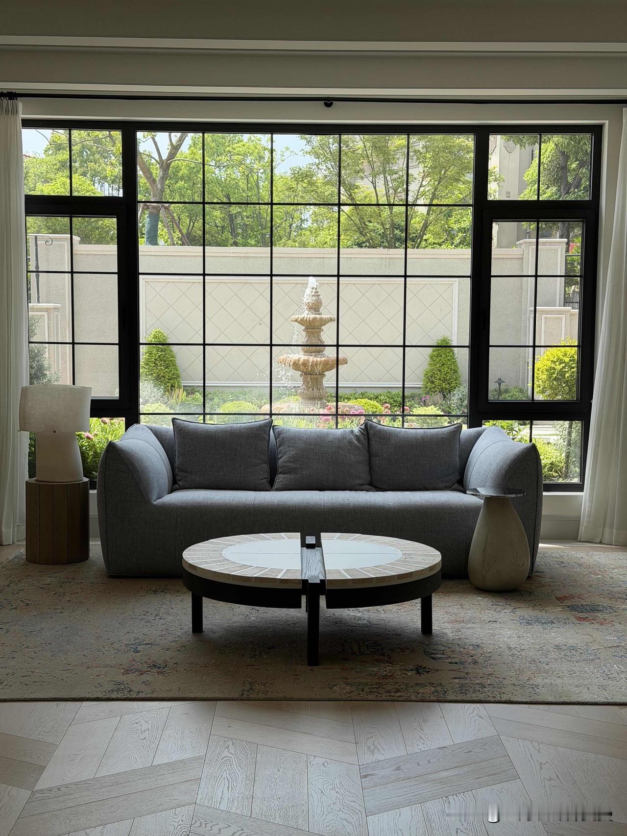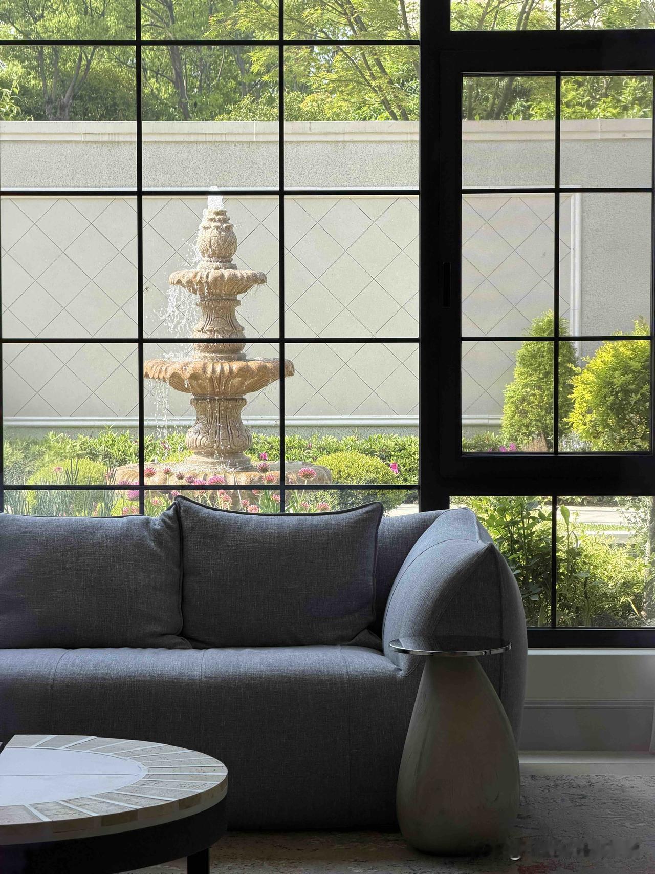 • 窗户选了黑色细框大玻璃,还原了法式复古窗型的同时,比传统钢窗省了一半成本,还把庭院的喷泉景观框成了天然画框